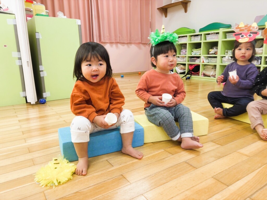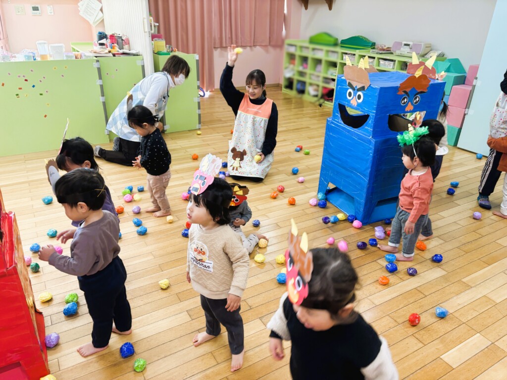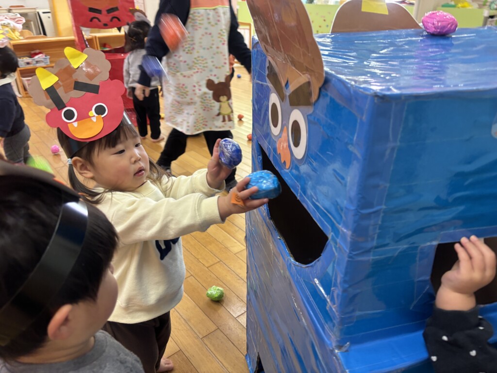 0・1歳児の子どもたちも、鬼のボール入れの遊具を使って豆まき遊びをみんなで楽しみました♪