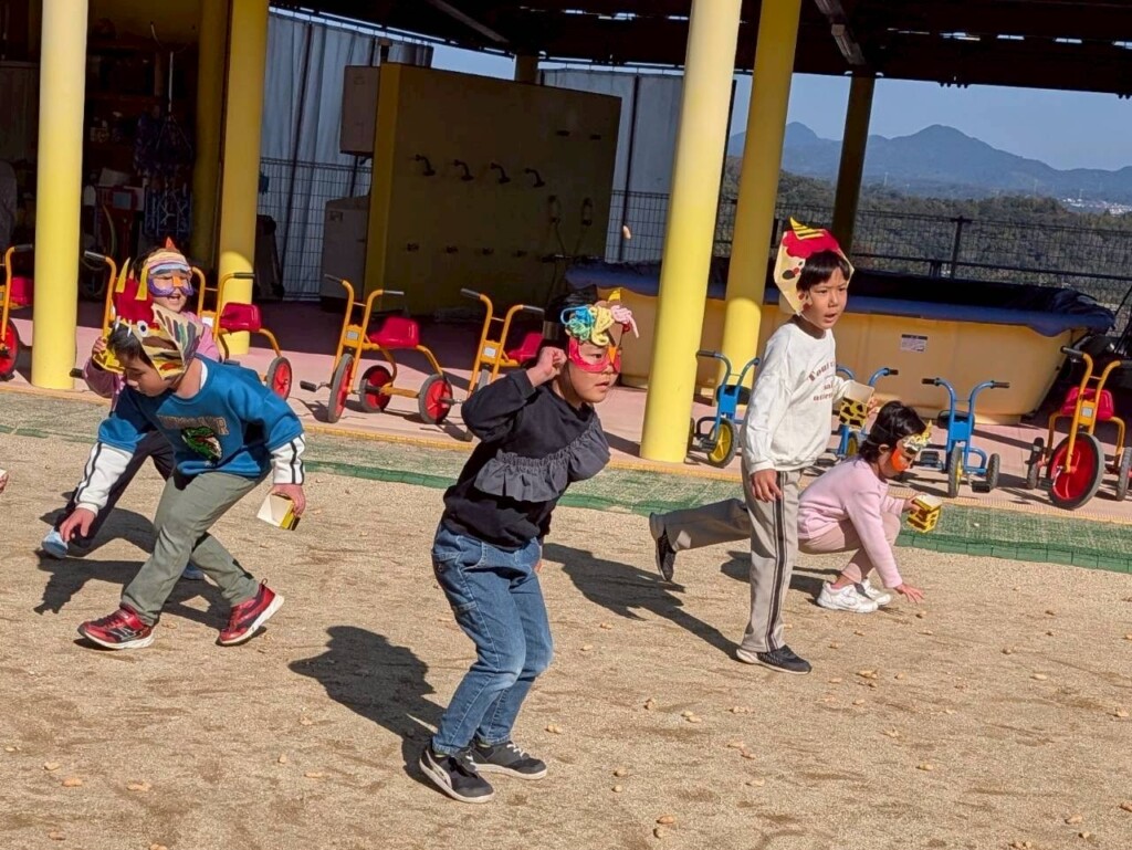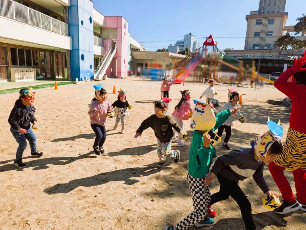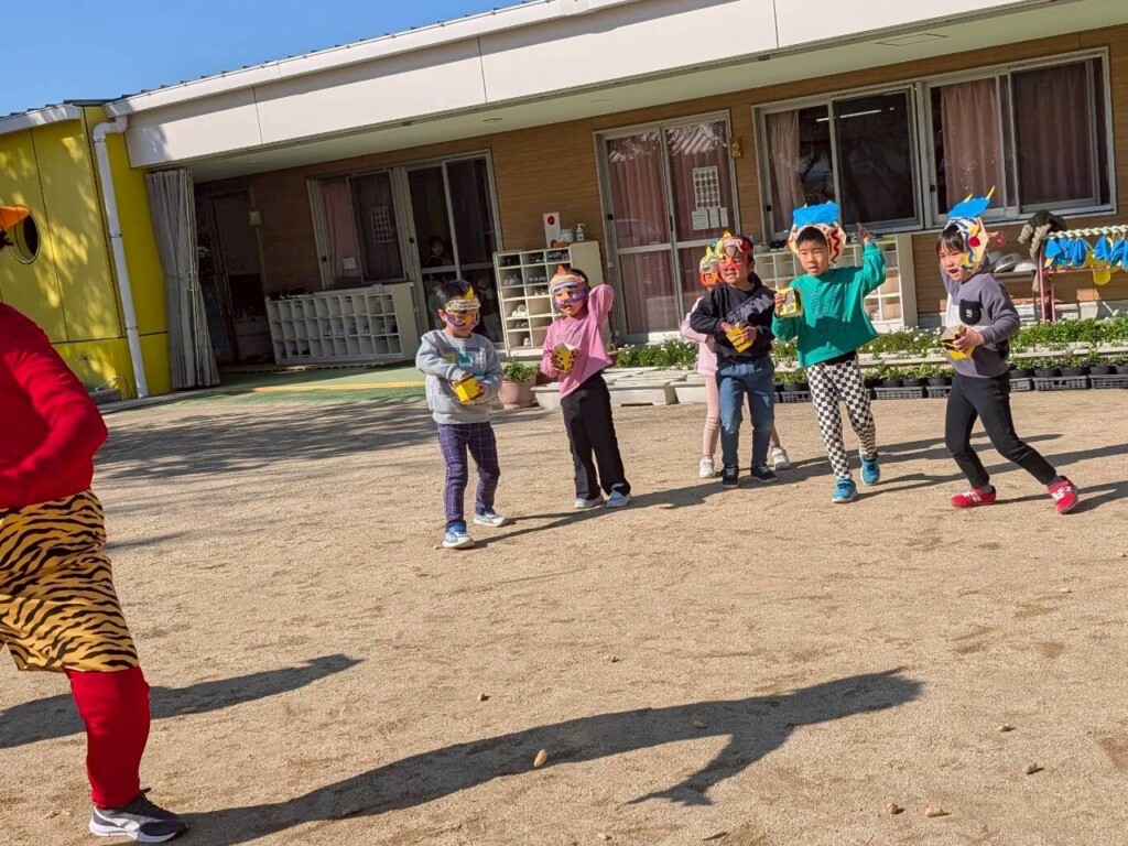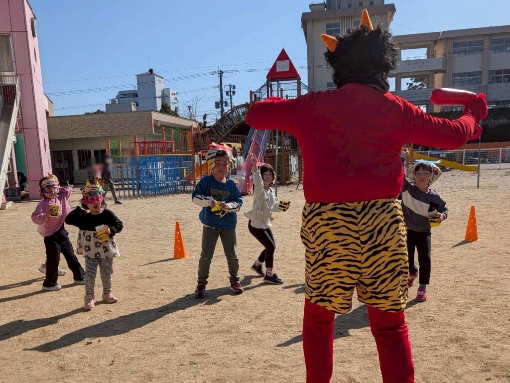鬼が登場すると、「おにはそと~!ふくはうち~!」と力いっぱい豆を投げる子どもたち。