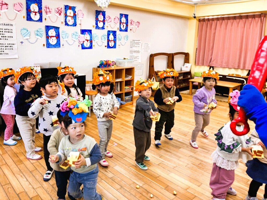 今日は、子どもたちがドキドキして待っていた園内豆まきがありました。