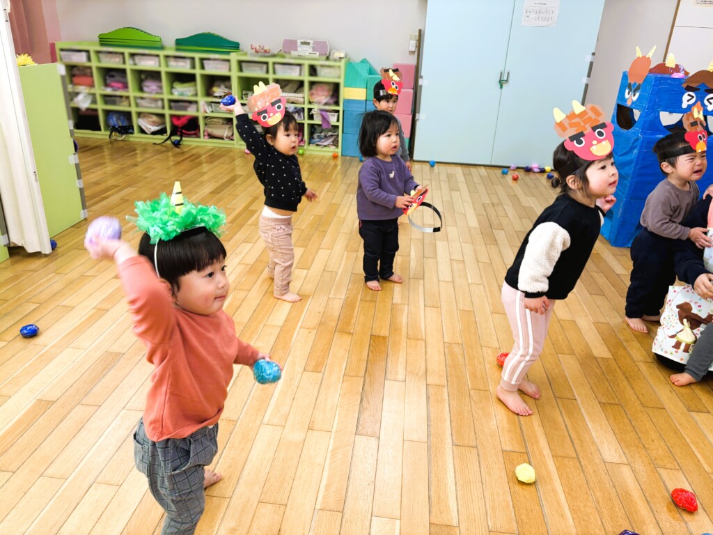 保育者と一緒に、「おにはーそと!」と新聞紙ボールを夢中で投げて楽しんでいましたよ♡