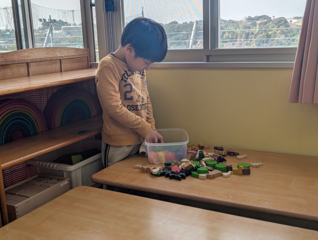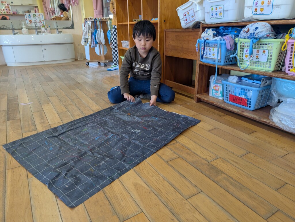 お部屋の遊具や道具の片付けも「きのこが1つ足りないから探さないと!」「お絵描きのシートがぐちゃぐちゃだな」と1つ1つ確かめながら頑張っています!