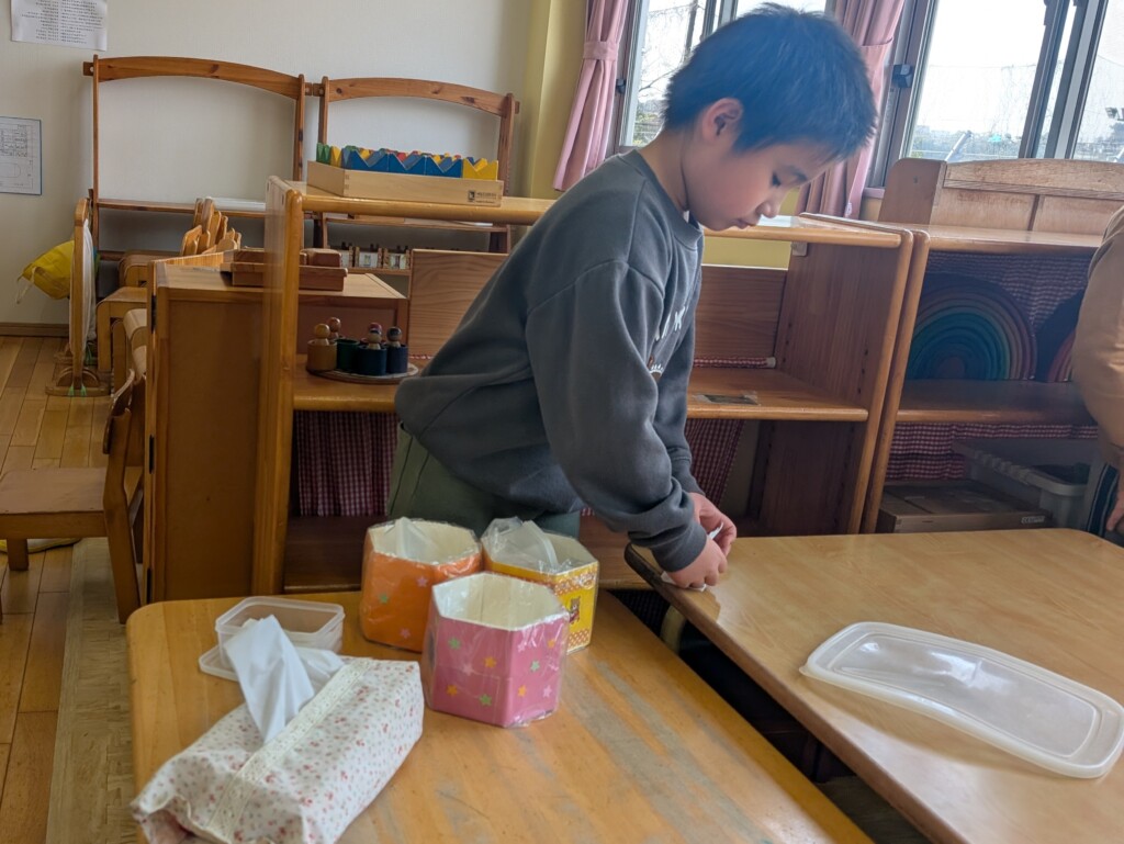 毎日交代で、床をほうきで掃く・雑巾で床を拭く・ティッシュを畳む・明日の給食の献立を書く・部屋の掃除をすることの5つの掃除や準備を取り組んでいます。