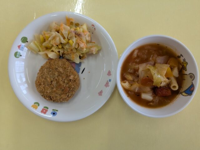 今日の献立は、豆のミネストローネ、メンチカツ、コーンサラダでした。