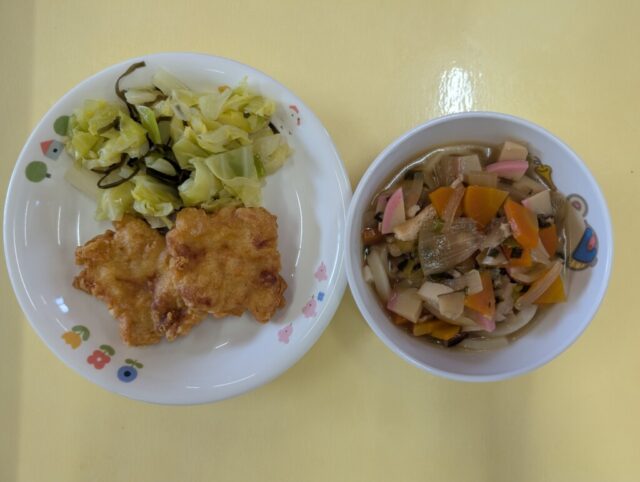 きつねうどんは、かつおとしいたけからだしをとっております。子どもたちが食べやすい優しい味わいのうどんとなっております。