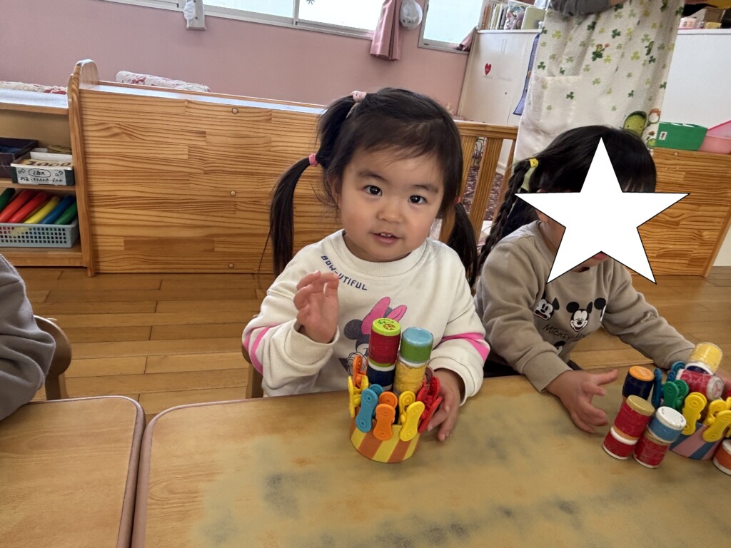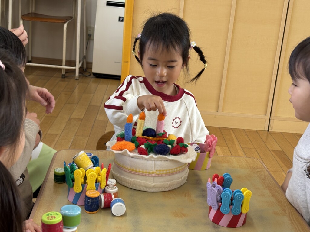 まずは自分たちでオリジナルのケーキ作りをしました。今回は、テープ芯やアイクリップ、ペットボトルのキャップ遊具を使ってケーキ作り。テープ芯のまわりにアイクリップを付けたり、テープ芯の中にキャップ遊具を詰めたり、まわりに並べたりして素敵なケーキが完成していました。大きなフェルトのケーキにもお友達が一人ずつ果物を選んでのせてくれました☆最後にRちゃんも好きな果物をのせて、ろうそくを3本立てて完成!