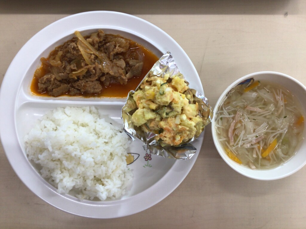 今日の献立は、ごはん、ビーフンスープ、元気もりもりポークチャップ、さつま芋サラダでした。さつま芋サラダは、さつま芋の甘さとチーズの塩味がよく合いマヨネーズ味のサラダとなっています。
