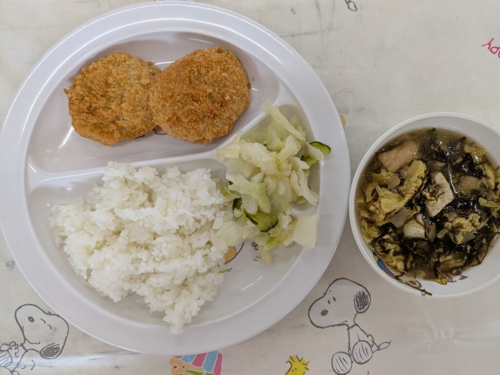 今日の献立は、ごはん、もずくスープ、うまいぞぶりカツ、レモンの和え物でした。もずくスープは、かつおとしいたけのおだしにもずくや鶏肉のうま味が溶け出した優しいスープになっております。
