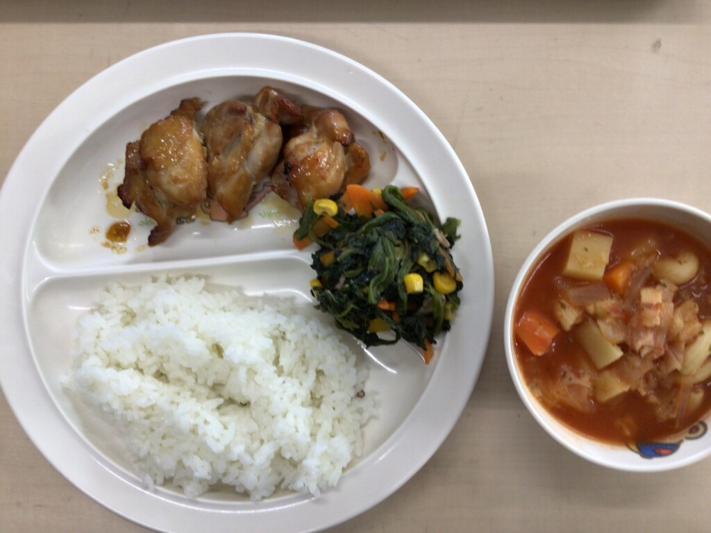 今日の献立は、ごはん、具だくさんミネストローネ、鶏肉のマーマレード焼き、ほうれん草のソテーでした。ほうれん草のソテーは、バターの風味とベーコンの塩味がほうれん草とよく合い子どもたちもよく食べてくれます。