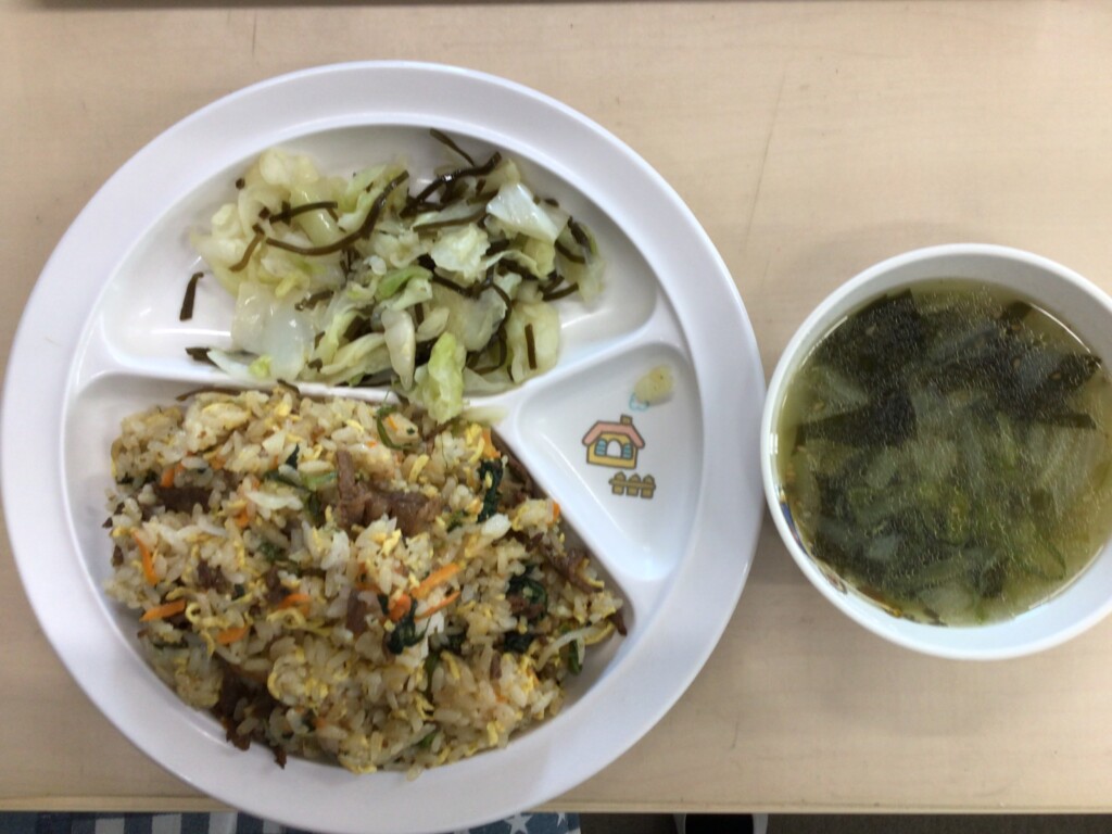 今日の献立は、わかめスープ、力もりもりビビンバ、即席漬けでした。わかめスープは、わかめがたっぷり入ることで食物繊維やミネラルを多く摂ることができます。