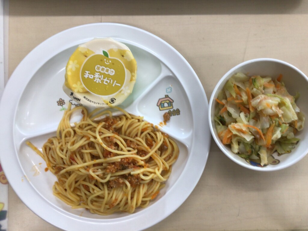 今日の献立は、ミートソーススパゲッティ、さっぱりサラダ、梨ゼリーでした。ミートソーススパゲッティは、お野菜や肉のうま味がたっぷり詰まったおいしいミートソースです。子どもたちが大好きなメニューです。