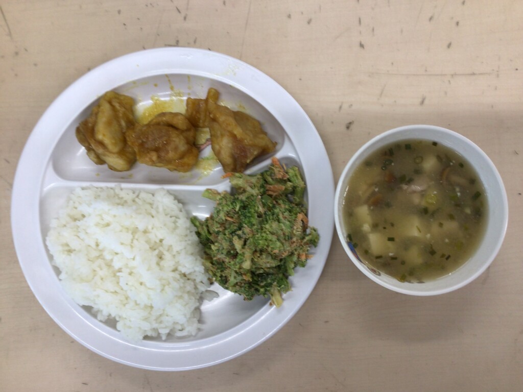 今日の献立は、ごはん、みぞれ汁、鶏のカレー甘酢和え、ブロッコリーのおかかマヨでした。みぞれ汁はたっぷりのおろした大根が入り、なめこのとろっとした食感がくせになるおいしさです。