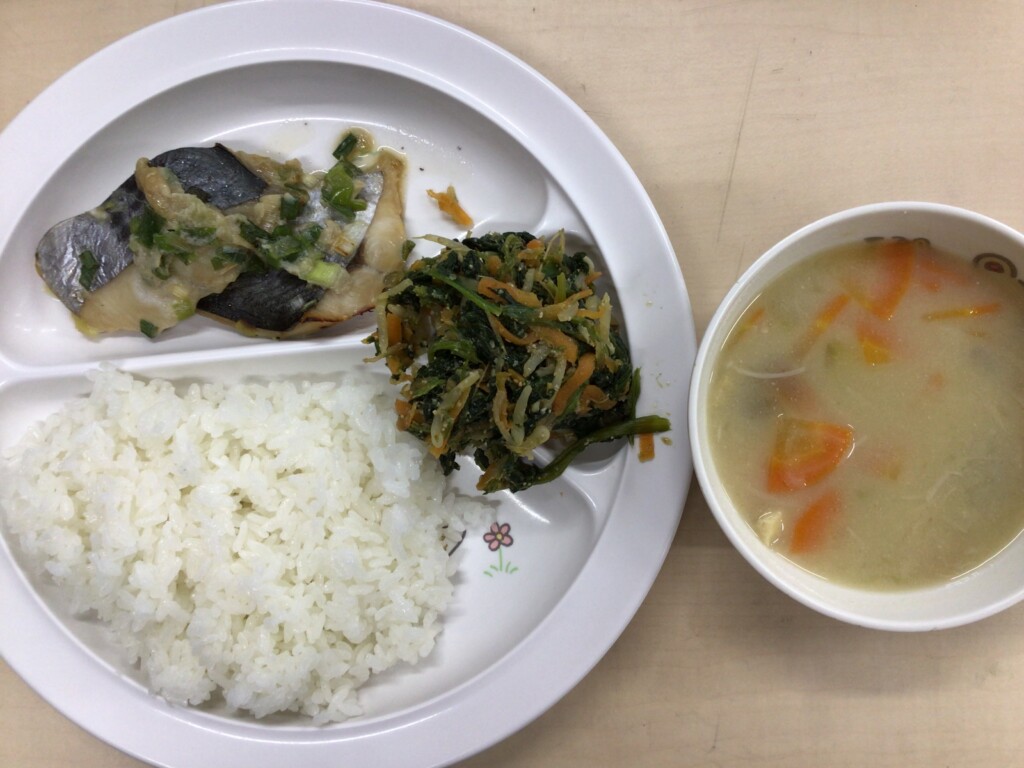 今日の献立は、ごはん、さつま芋のみそ汁、魚のネギ焼き、ほうれん草のごま和えでした。さつま芋のみそ汁は、さつま芋の甘さが溶け出しおだし自体も甘めでホクホクしたさつま芋がおいしいお汁です。