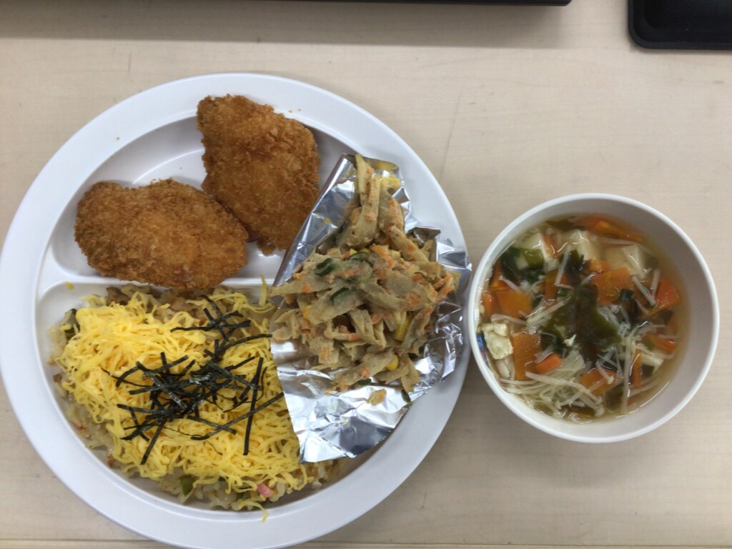 今日は1月のお楽しみメニューでした。献立は、ちらし寿司、すまし汁、鮭のチーズフライ、ごぼうサラダでした。ごぼうサラダは、子どもたちが食べやすいようやわらかく加熱しています。顎を鍛える「カミカミメニュー」の一つです。子どもたちが好きなサラダです。
