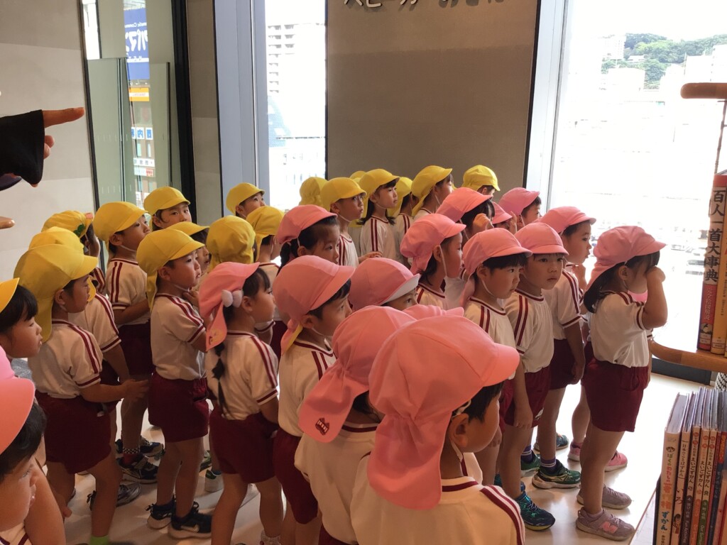 幼稚園を出発して、天文館に向かいました。天文館図書館に着くまでに、市電を見たり、照国神社を見付けたりしました。
