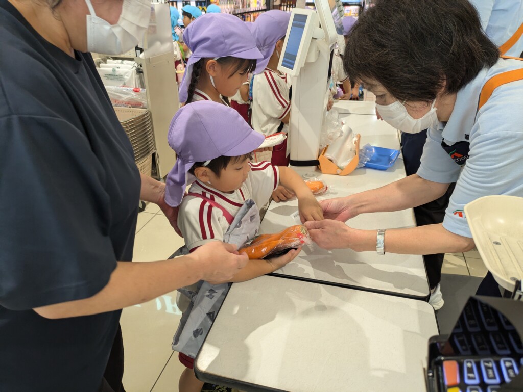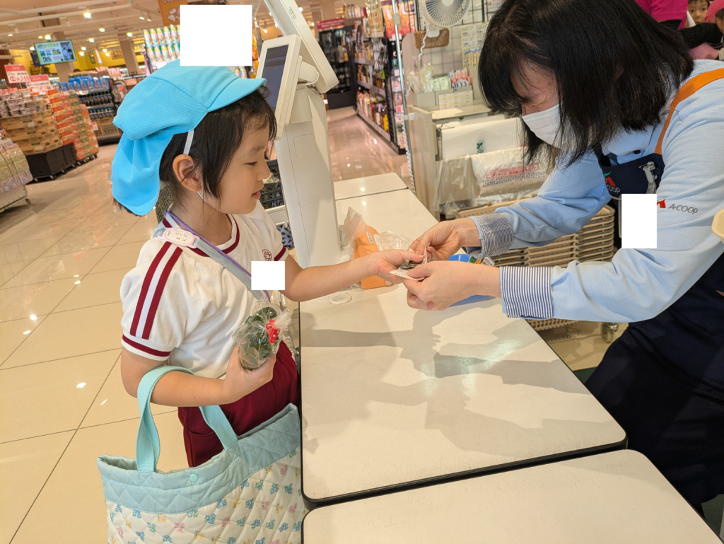 その後は、それぞれ保護者の方から頼まれた買い物をしました。同じ品物でも色々な種類があり、どれにしようか迷う子どもたちもいましたが、レジでお金を払ったり、おつりをもらったりして全員買い物をすることができました!