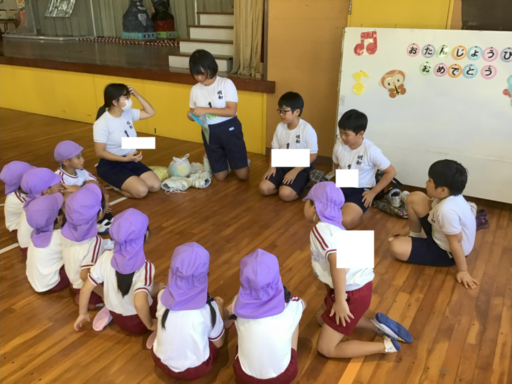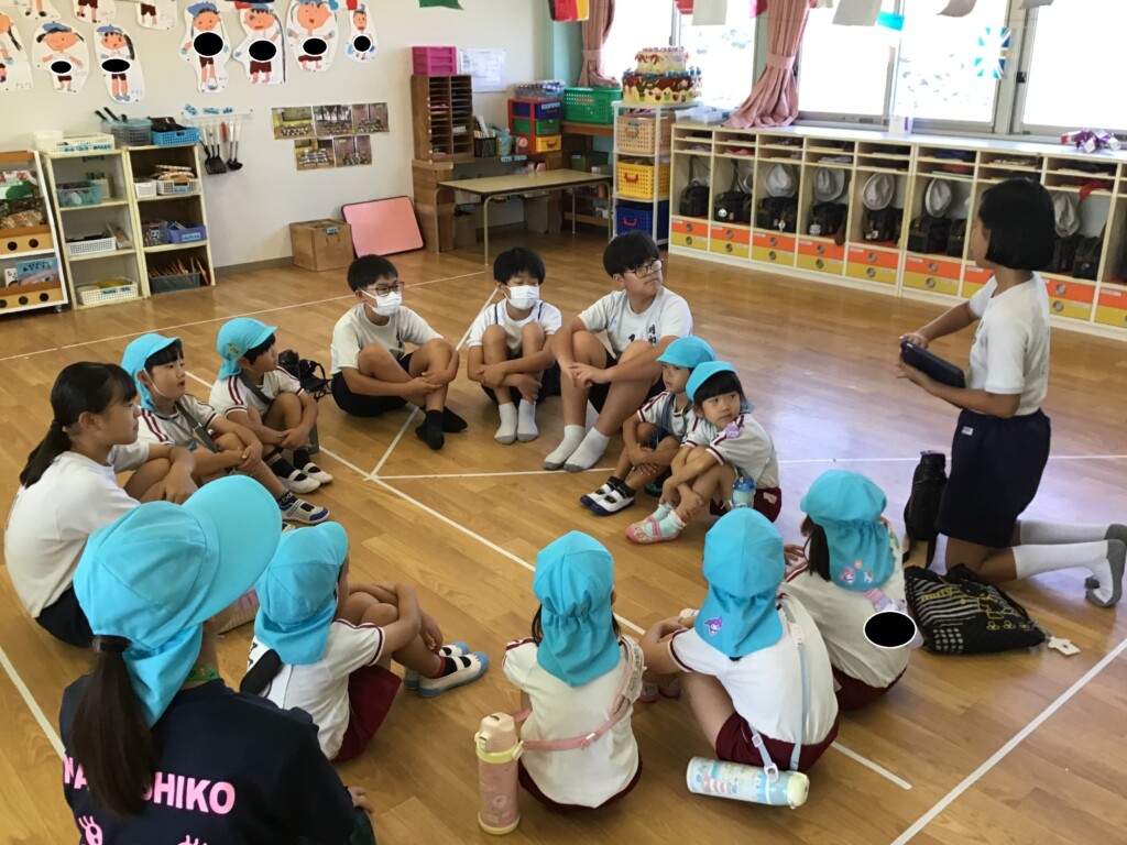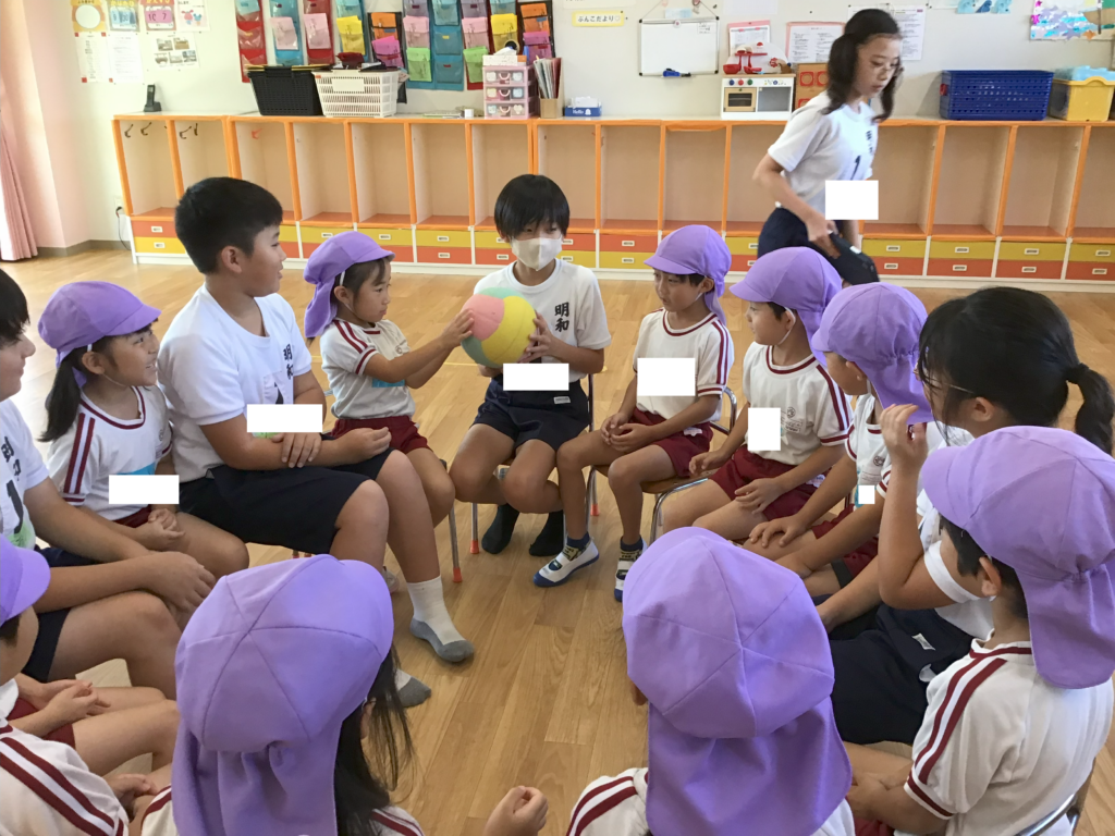 10月6日に明和小学校の5年生のお兄さん・お姉さんたちと年長組の子どもたちで、交流会がありました!この日のために、5年生の皆さんが楽しい手遊びやゲーム・読み聞かせを考えてきてくれました!それぞれグループに分かれるとまずは自己紹介をしました。5年生が作ってきてくれたお名前のシールを使って、ドキドキしながらお話してくれましたよ♪その後は、外でだるまさんが転んだをしたり、お部屋でフルーツバスケットをしたり、どのグループもたくさん遊ぶことができました。「お兄さん、こっちにきて!」や「まだ一緒に遊びたい!」などの声があちこちで聞こえてきて、楽しい時間になったようでした☆彡楽しかったお話をお家でも聞いてみてくださいね♡