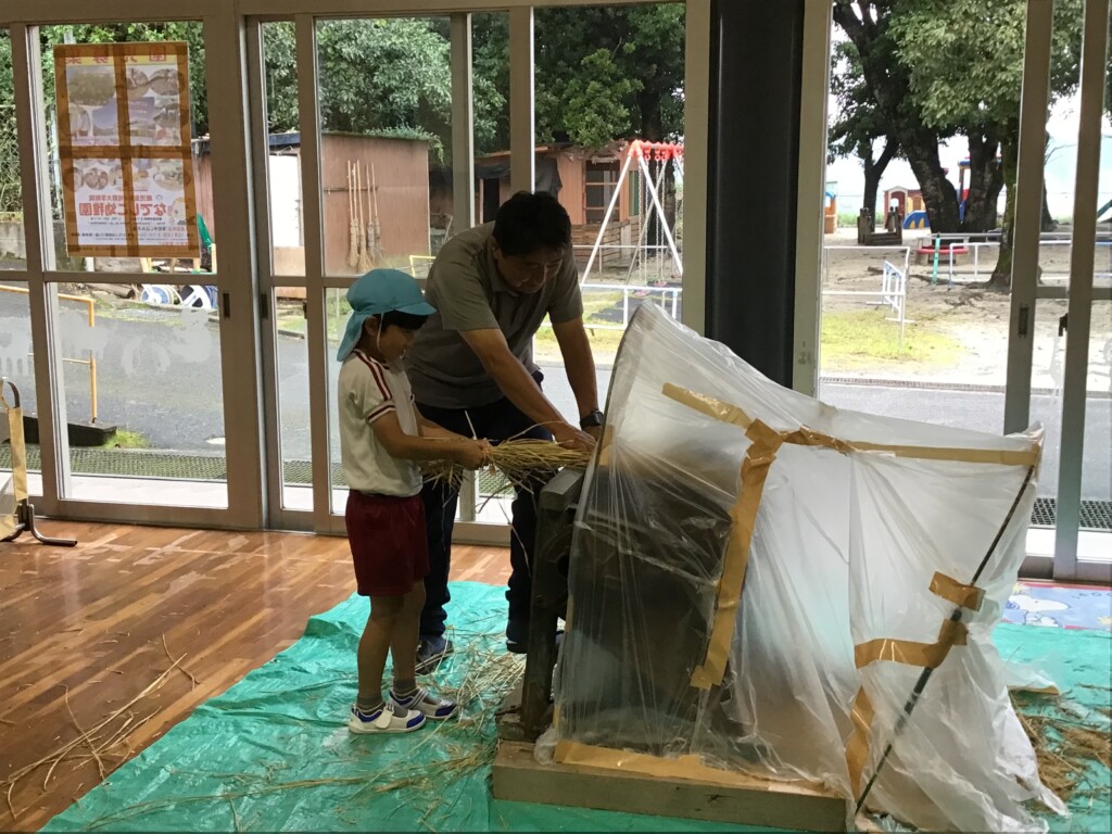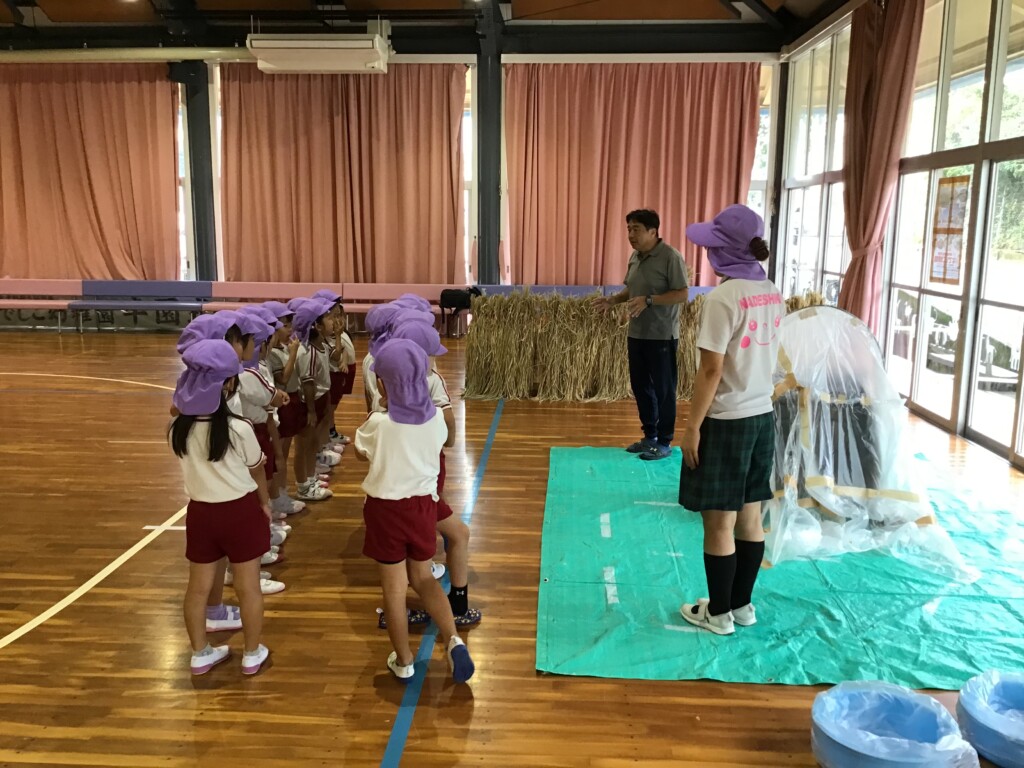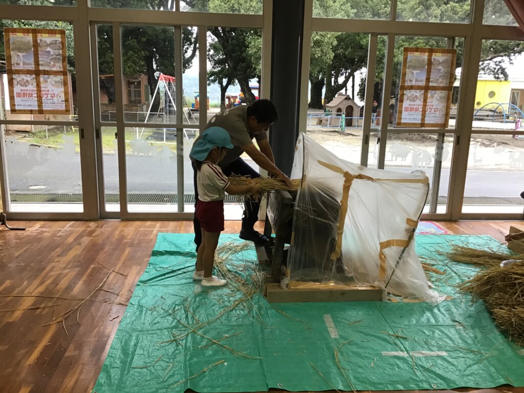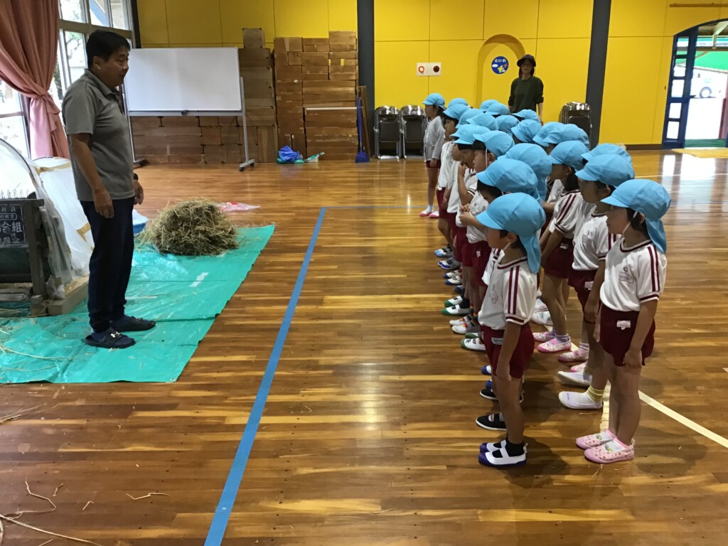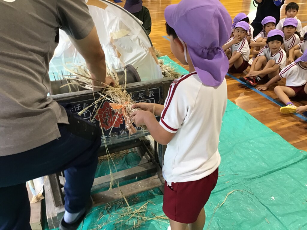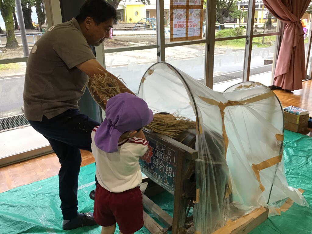 10月20日に年長組が脱穀をしました。9月に刈って稲架掛けしたした稲もあっという間に薄茶色になりました!今日は「足踏み脱穀機」という道具を使いましたよ♪初めて使う道具でしたが、どの子もバスのおじちゃんと一緒に一生懸命頑張りました☆彡「お米がどんどん落ちている!」「たくさん収穫できたね!」と嬉しそうに話す子どもたちでした♡次はいよいよおにぎりパーティーです!今日脱穀したお米を精米して準備をしていきたいと思います!