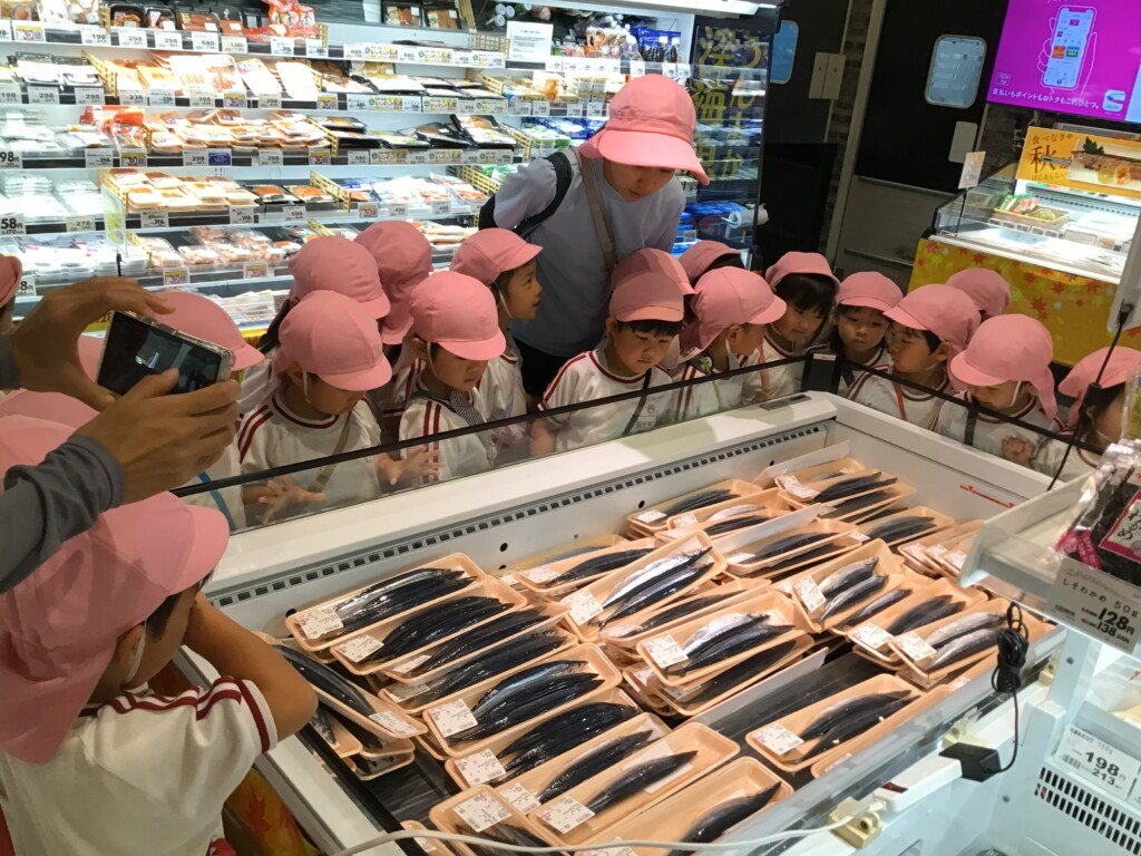 たくさんの品物に目をキラキラさせながら探検していた子どもたち。果物や野菜、鮮魚やお肉など身近な食べ物や、総菜やパン・お菓子や調味料なども見学しました。そして、事前にクラスで何を買うか話し合い、みんなでわけて食べられるように果物ゼリーを購入しました!