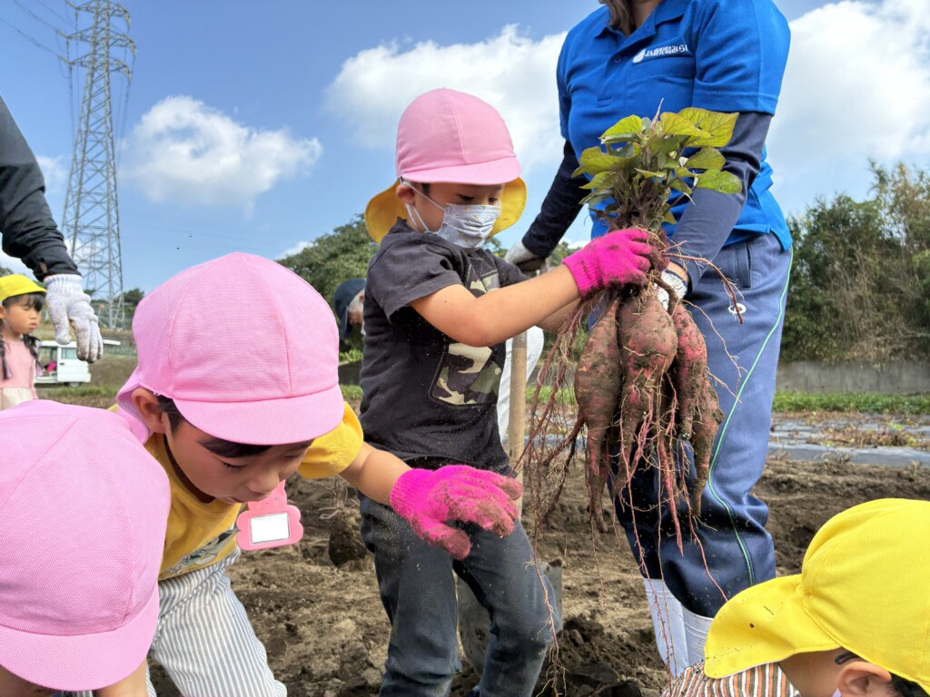 芋畑に着くと掘り方の説明を聞いて早速掘り始めました!土の中から芋が見え始めると「芋が出てきた!」「大きそう!」など嬉しそうに話していました。1人では抜くことが難しいくらい大きなお芋もありましたが、お友達と一緒に土を掘ったり、蔓を引っ張ったりして、たくさんのお芋を収穫することができました。「小さい組さんにも分けられそう!」「早くおうちに持って帰りたいな♪」とどの子も芋ほり遠足を楽しむことができました♡