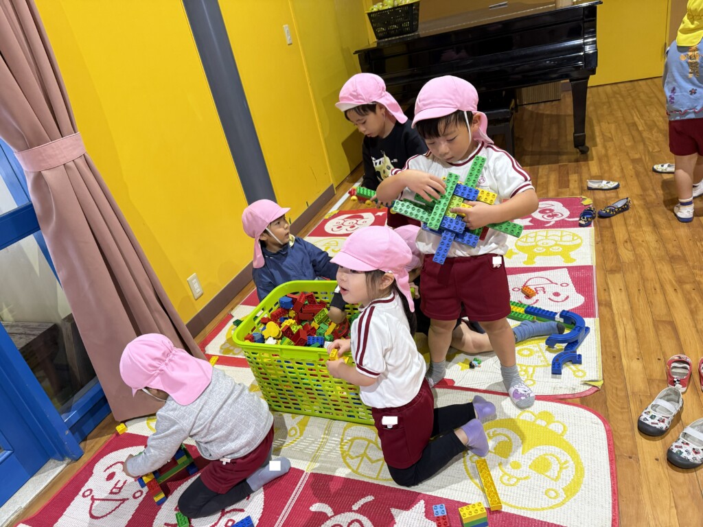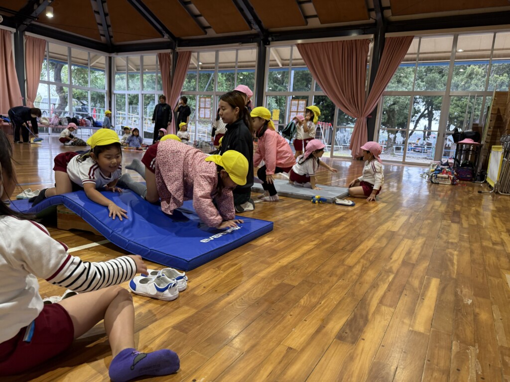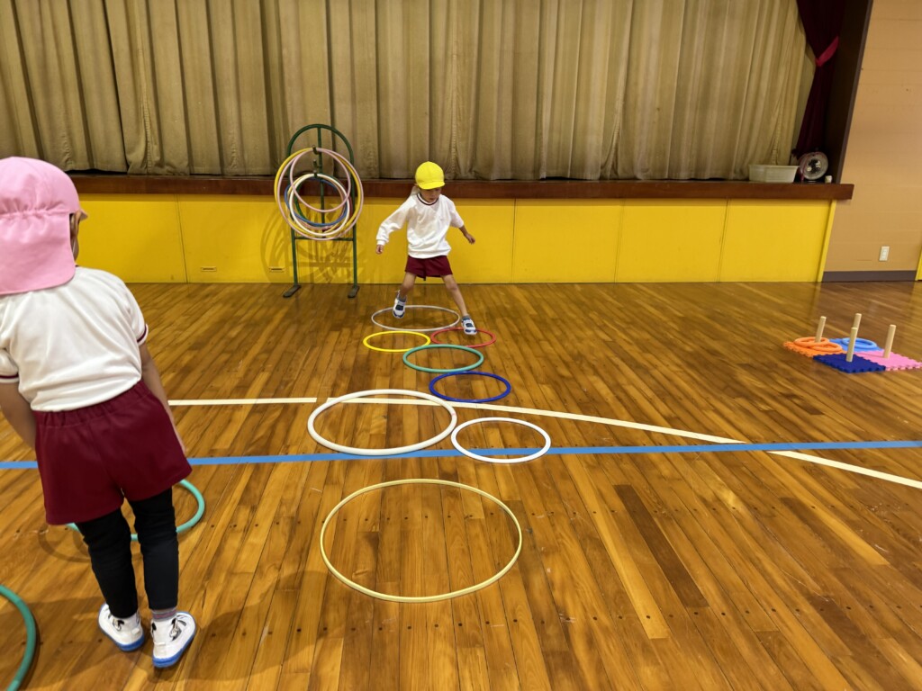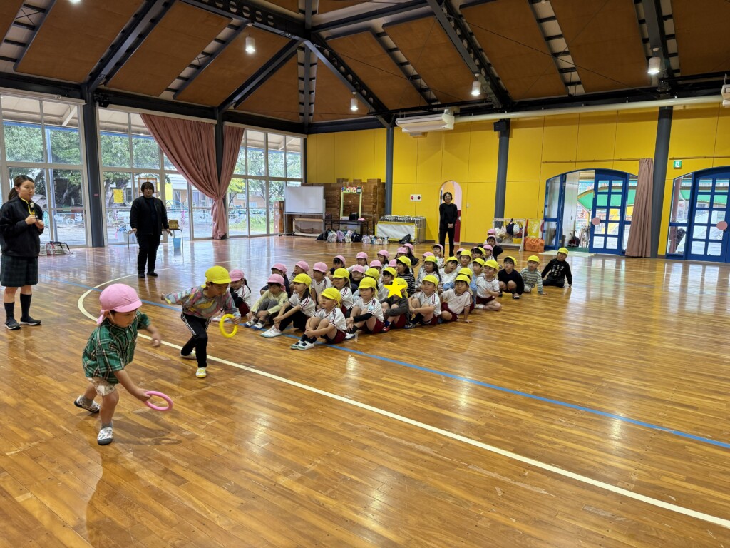 ご飯を食べ終わったら、リズム室内で、フラフープをしたり、トンネルをくぐったりして遊びました。お弁当が早く食べ終わったので、運動会で憧れた、年長組さんのリレーを真似て、さくら組対ゆり組でリレー対決をしました!その後、休憩をし、10月のお誕生日デザートをみんなで食べました☆