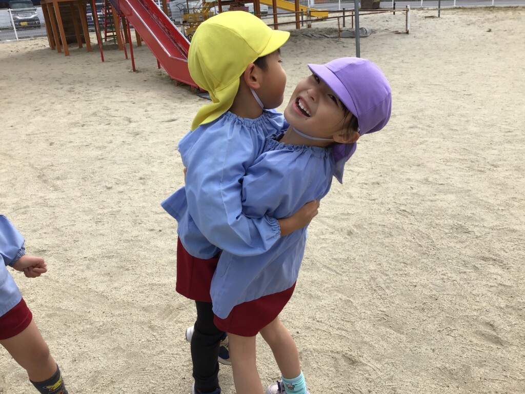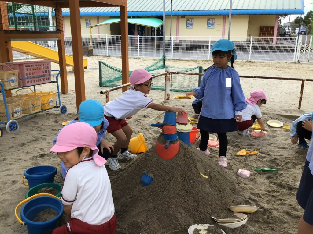 手を繋いで森を歩いたり、葉っぱを見つけて「これはいちょうの葉っぱだよ!」と、教えてくれたりと、大きい組さんのお兄さんお姉さんらしい姿をたくさん見ることができました☆彡他にも、滑り台を一緒に滑ったり、大きな山を作ったりして楽しく過ごすことができたみたいです(^^♪