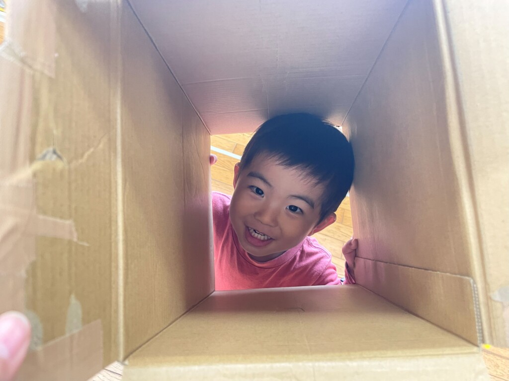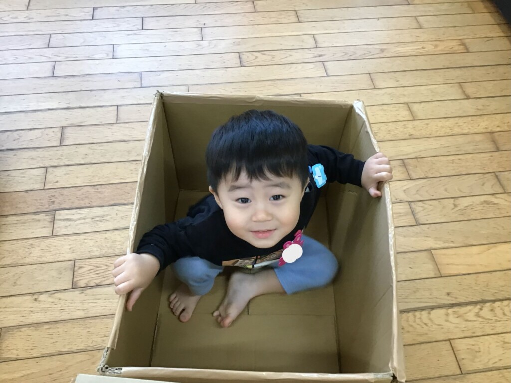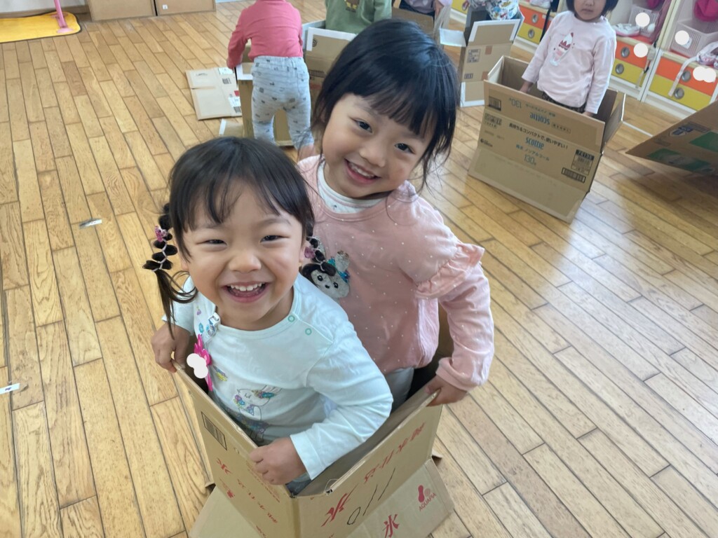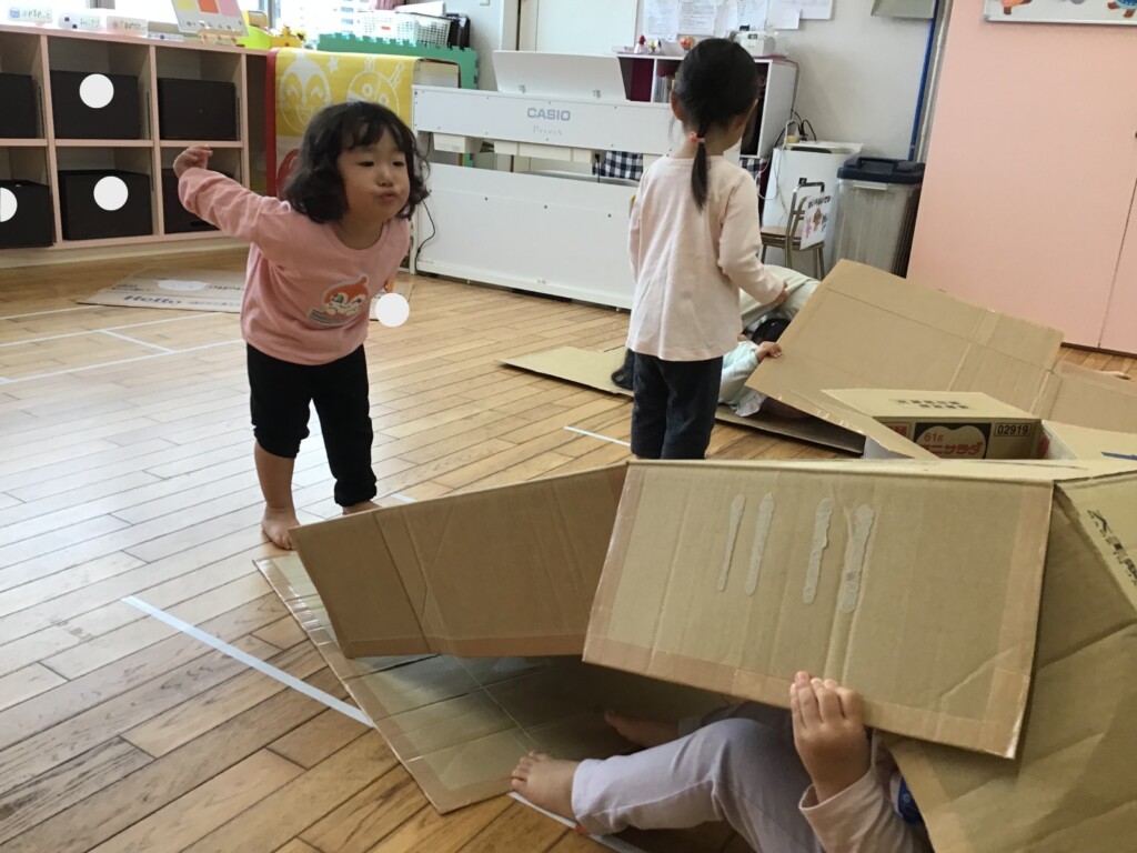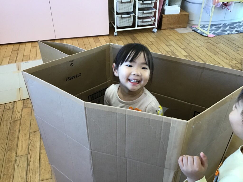 お家や幼稚園で良く見る段ボール!最初は、ただの箱だと思っていた年少少組さん。匂いや手触りを知り、箱の形以外での遊び方も発見しましたよ☆彡