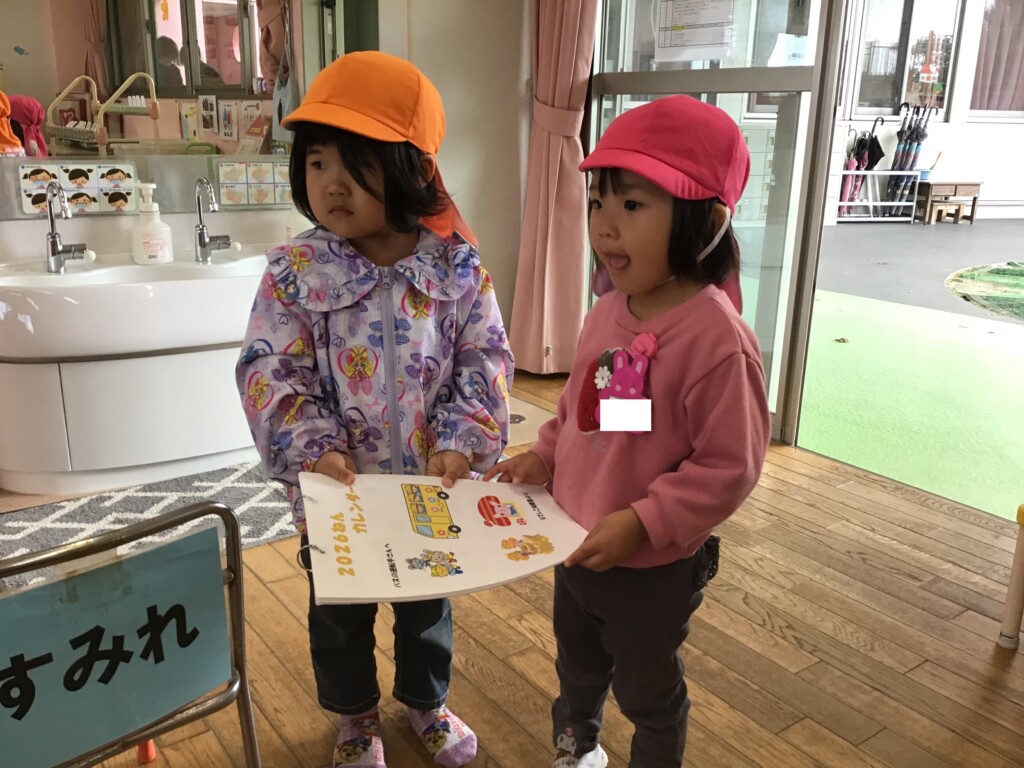 年少少組さんは、シールで飾り付けをしたカレンダーを、いつも幼稚園バスを運転してくれるバスの運転手さんたちに渡ました☘
