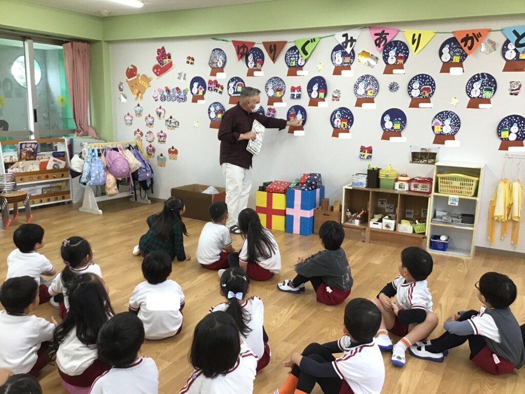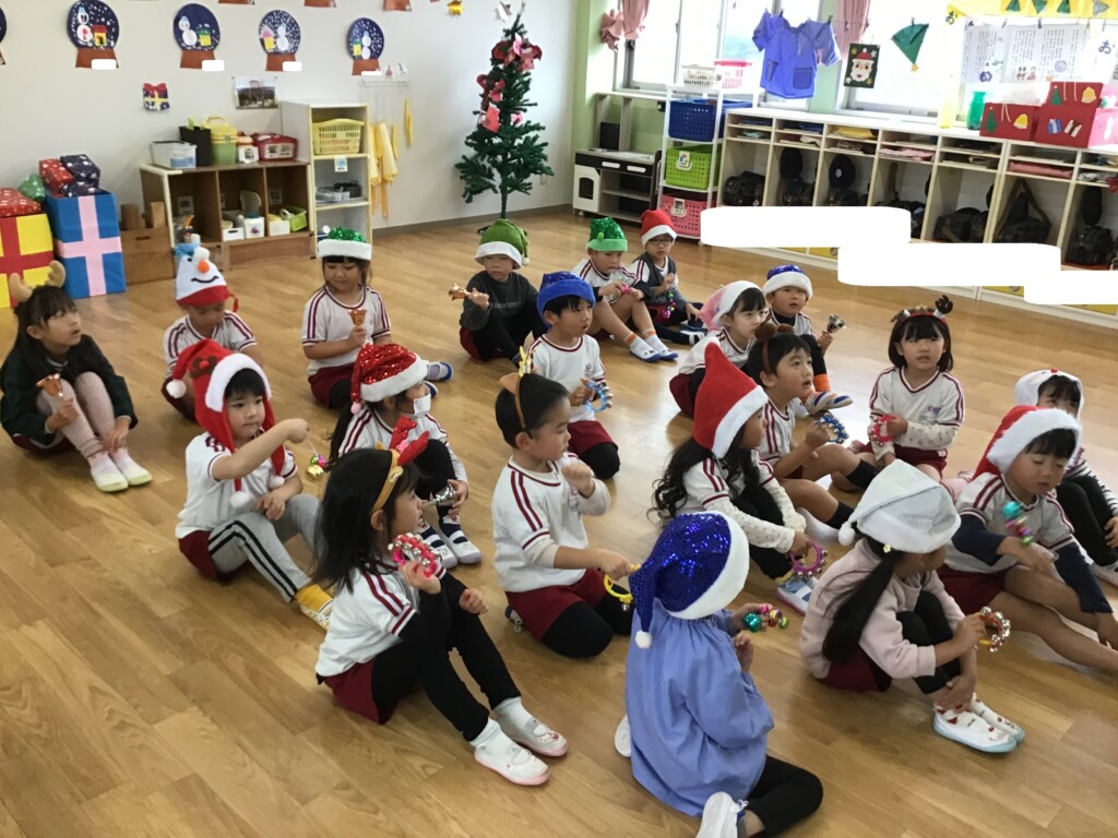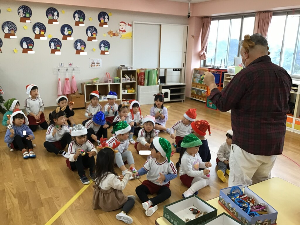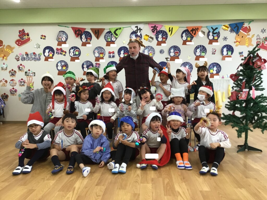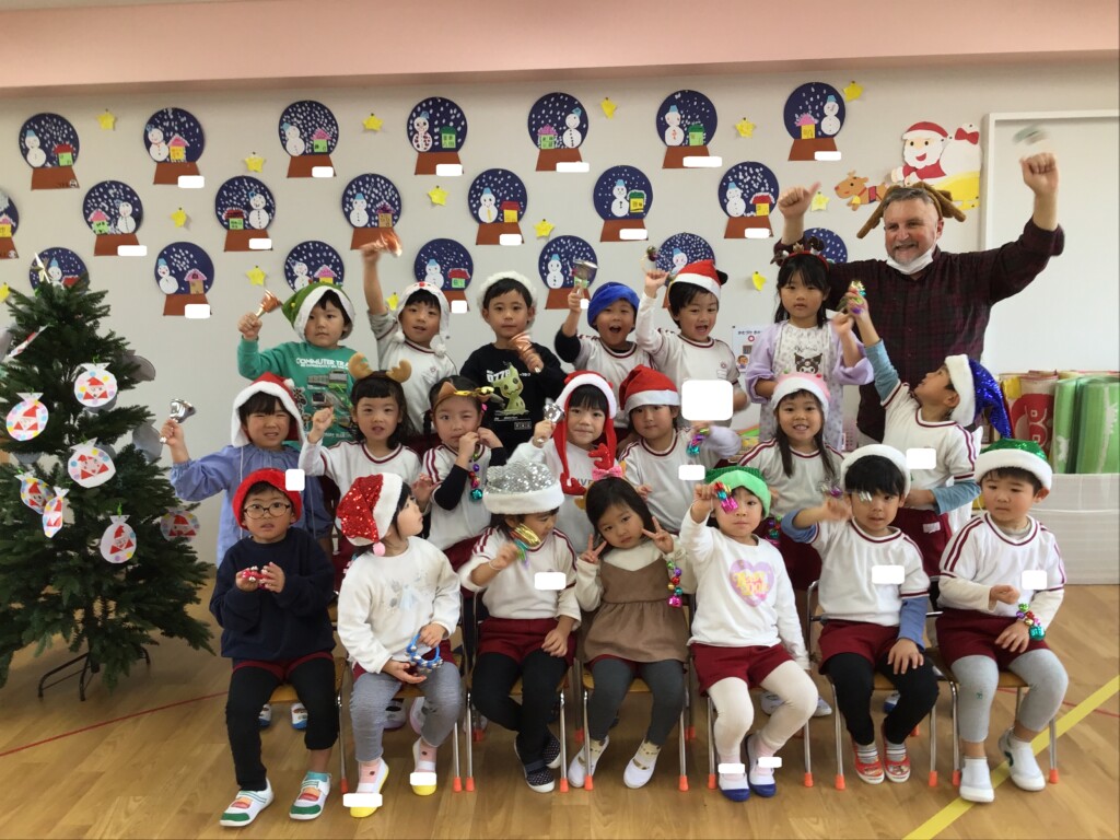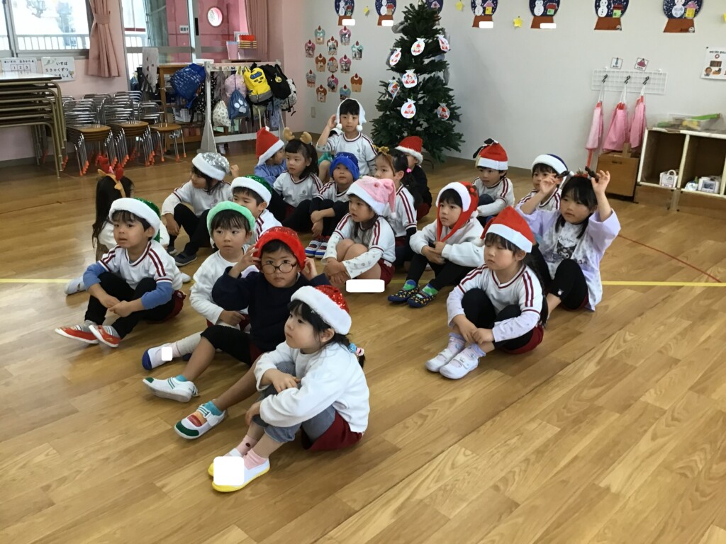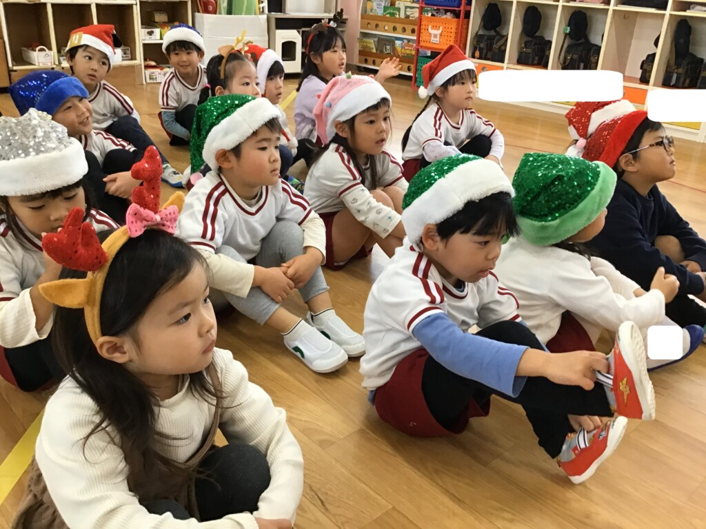 今日は“英語で遊ぼう”がありました。スコット先生から本場のクリスマスについてのお話を聞いたり、クイズをしたりしました★また、クリスマスの被り物を身に付けて、鈴を鳴らしながらクリスマスの歌を歌い、雰囲気を感じながら遊ぶことができました。