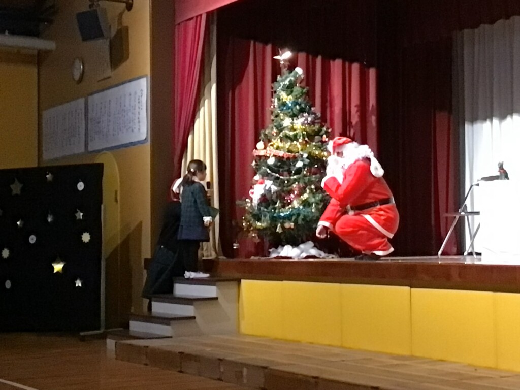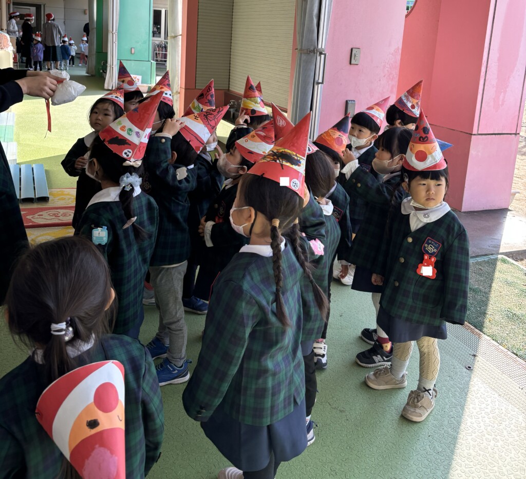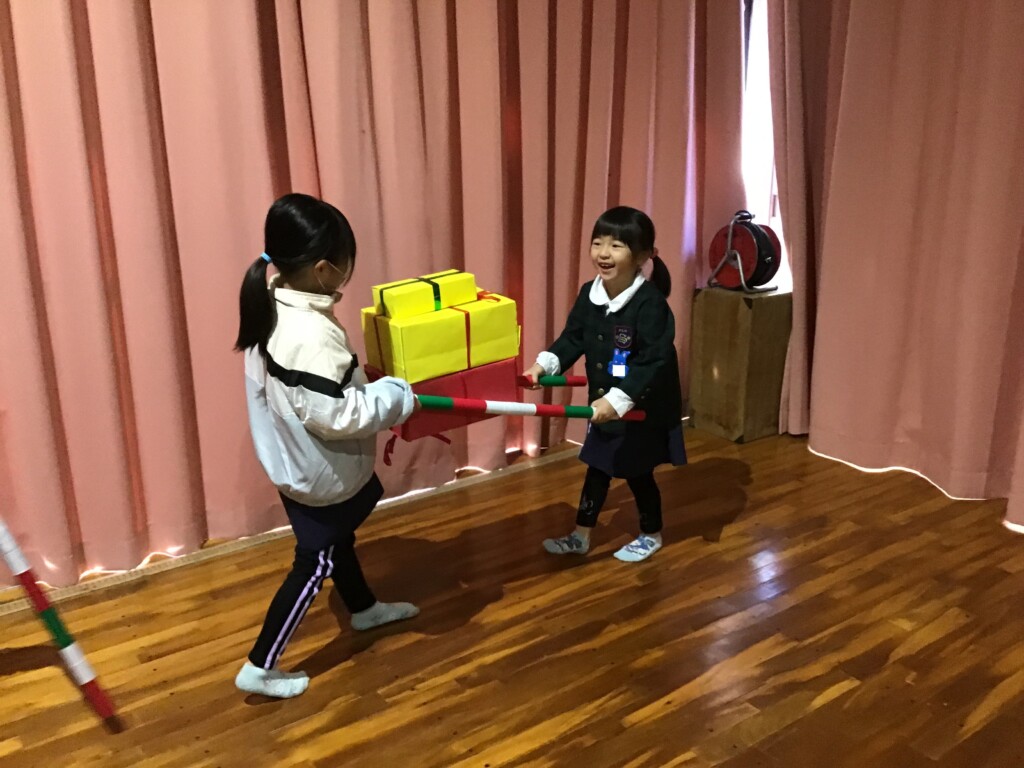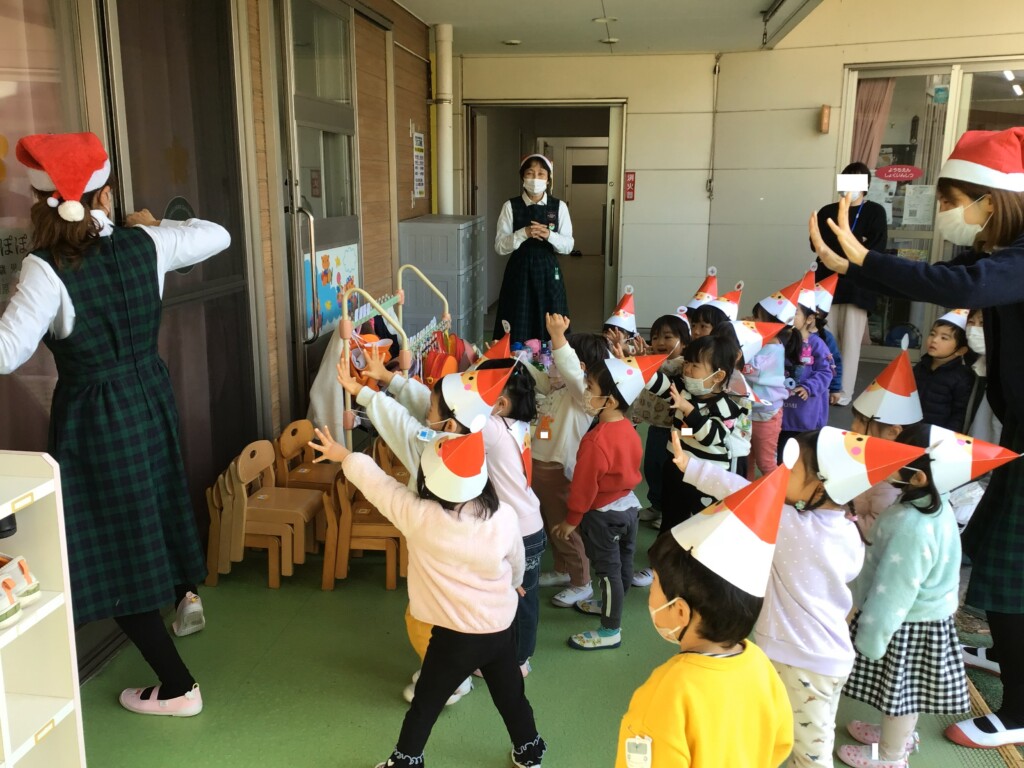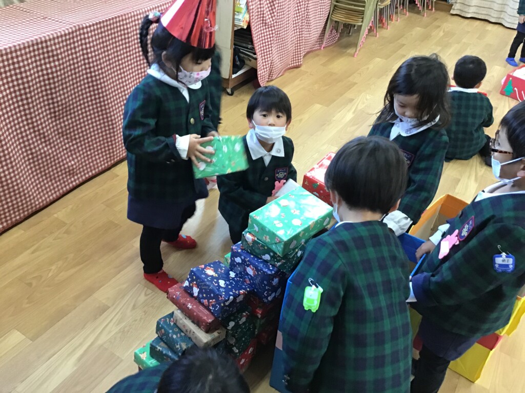 リズム室に向かうと、耳を澄ませていると、鈴の音が聞こえて、サンタさんが来てくれました!大急ぎで来たサンタさんのポケットに全部のクラスの本物が鍵が入っていました!あわてんぼうのサンタさんが、なんと、たくさんのプレゼントを持ってきてくれました!パズルや、ミニカーなど、素敵なプレゼントをいただけて、幼稚園のお友達は大喜びでした☆彡