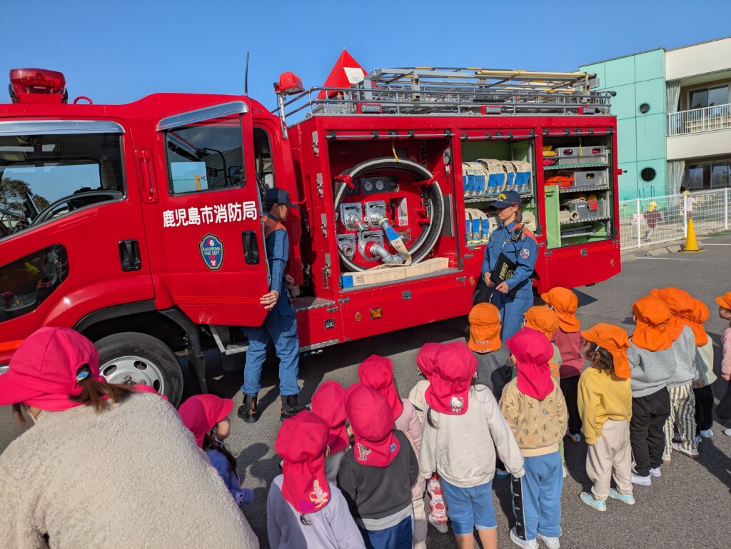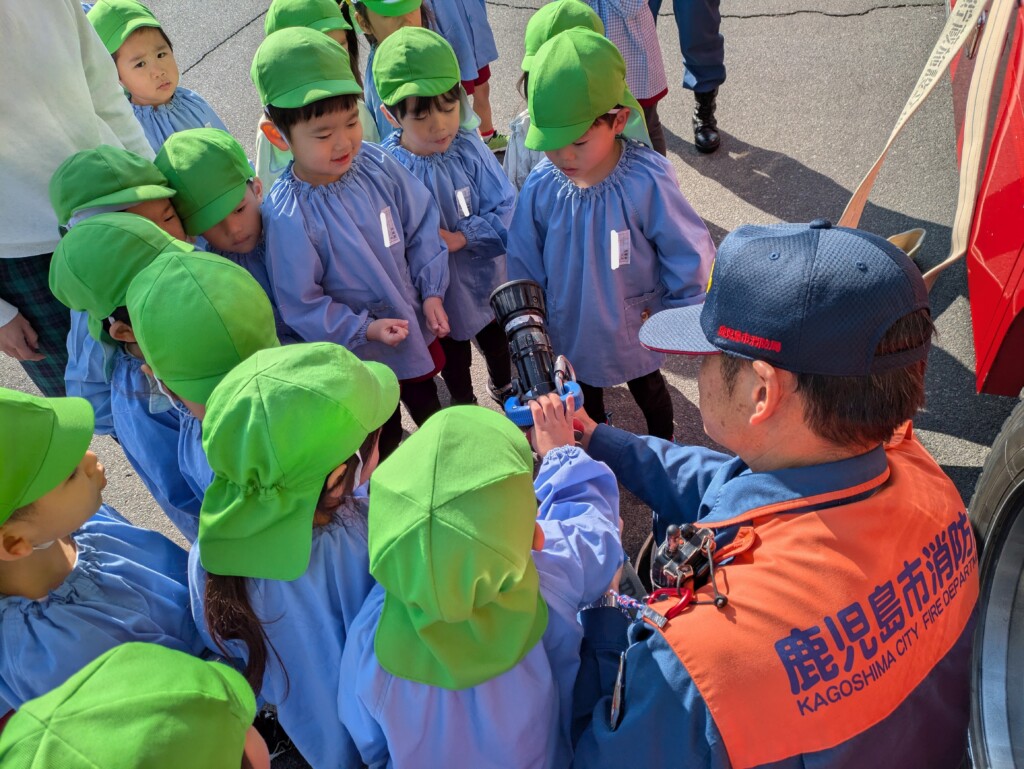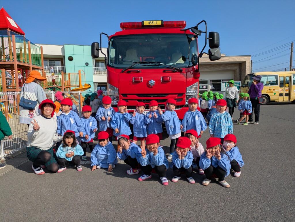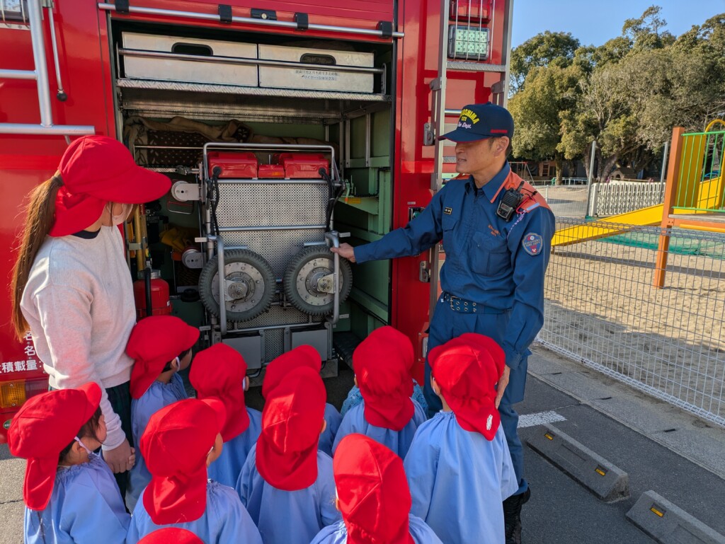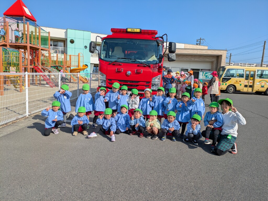 また、消防車が1台来たので、年少少・年少組が消防車の見学をしました🚒