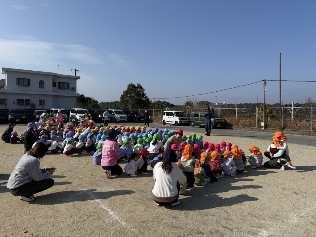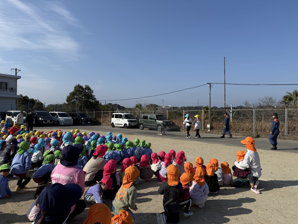 その後は、消防隊の方の話を聞いたり、幼稚園・保育園の先生が代表で消火器を使った消化の仕方の見本を見せてくれました!