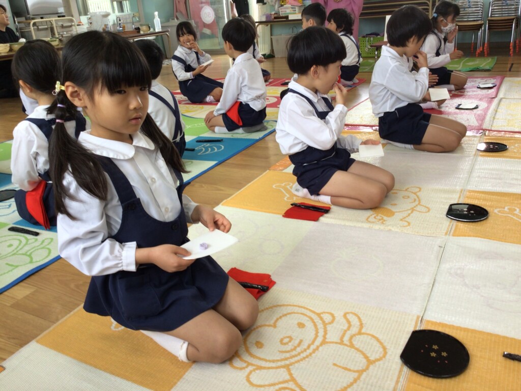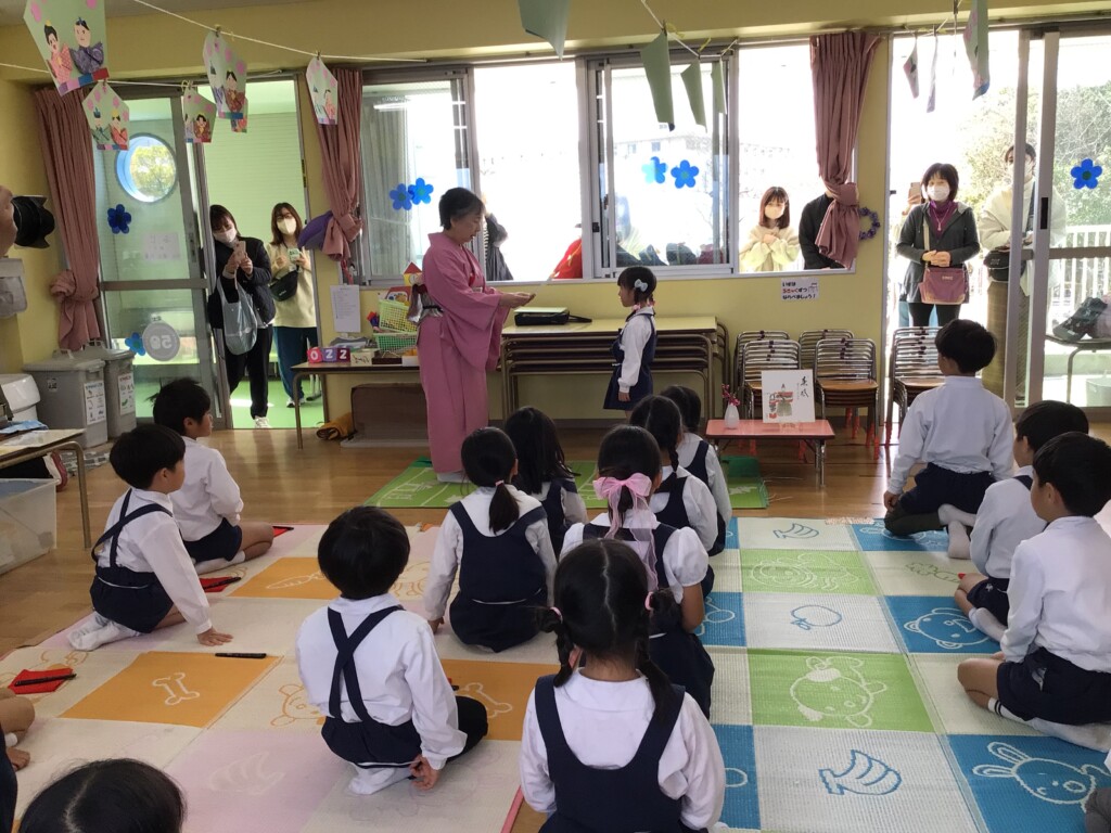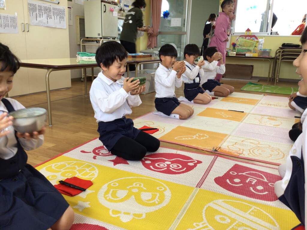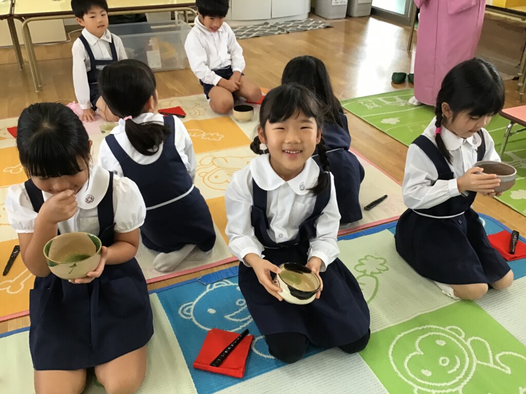2月26日に年長組で茶道がありました。1年間で6回の茶道教室があり、今日が最後の活動の日となりました。今日は、子どもたちにとっては2回目のお抹茶やお干菓子をいただく日で、前日からとっても楽しみにしていましたよ♪6回目ということもあり、初めの頃に比べて、運び方も相手への渡し方も、とっても上手になりました★お抹茶を飲んだ時には「苦くて飲めない…」と、渋そうな顔をする子たちもいましたが、活動後には「楽しかった!」と言っていました!そして、最後には1年間頑張った子どもたちに、山方先生から“おしるし”をいただきました。3月にお家に持って帰りますので、ご覧ください☆