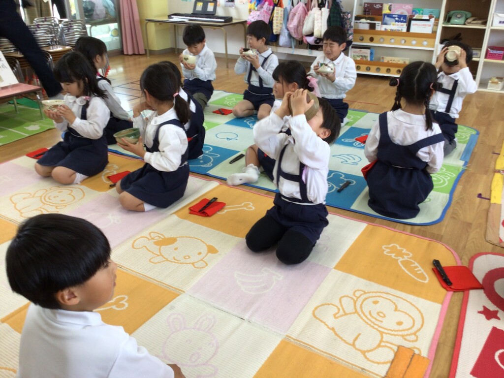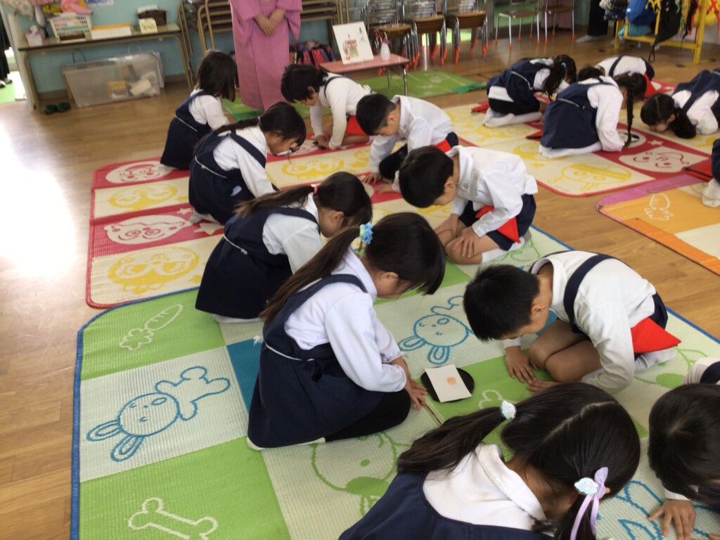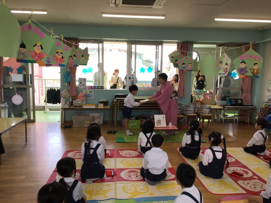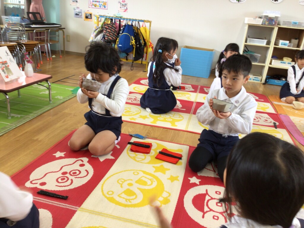 2月26日に年長組で茶道がありました。1年間で6回の茶道教室があり、今日が最後の活動の日となりました。今日は、子どもたちにとっては2回目のお抹茶やお干菓子をいただく日で、前日からとっても楽しみにしていましたよ♪6回目ということもあり、初めの頃に比べて、運び方も相手への渡し方も、とっても上手になりました★お抹茶を飲んだ時には「苦くて飲めない…」と、渋そうな顔をする子たちもいましたが、活動後には「楽しかった!」と言っていました!そして、最後には1年間頑張った子どもたちに、山方先生から“おしるし”をいただきました。3月にお家に持って帰りますので、ご覧ください☆