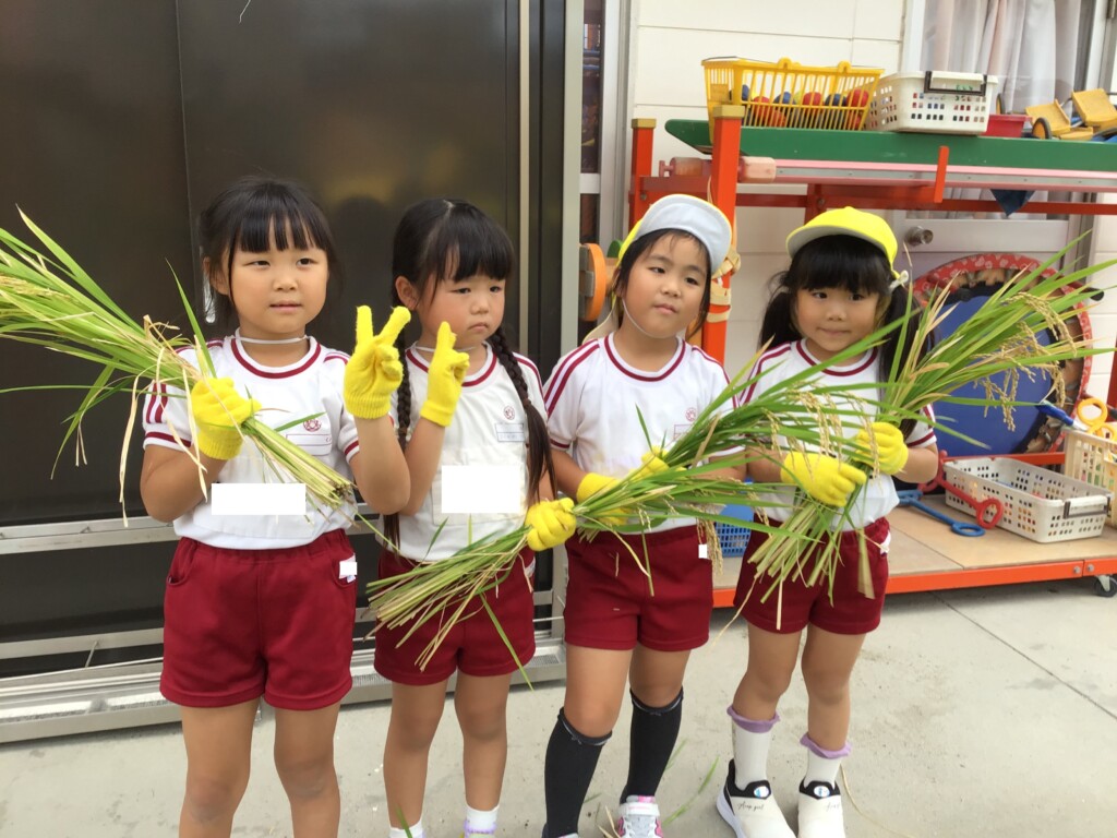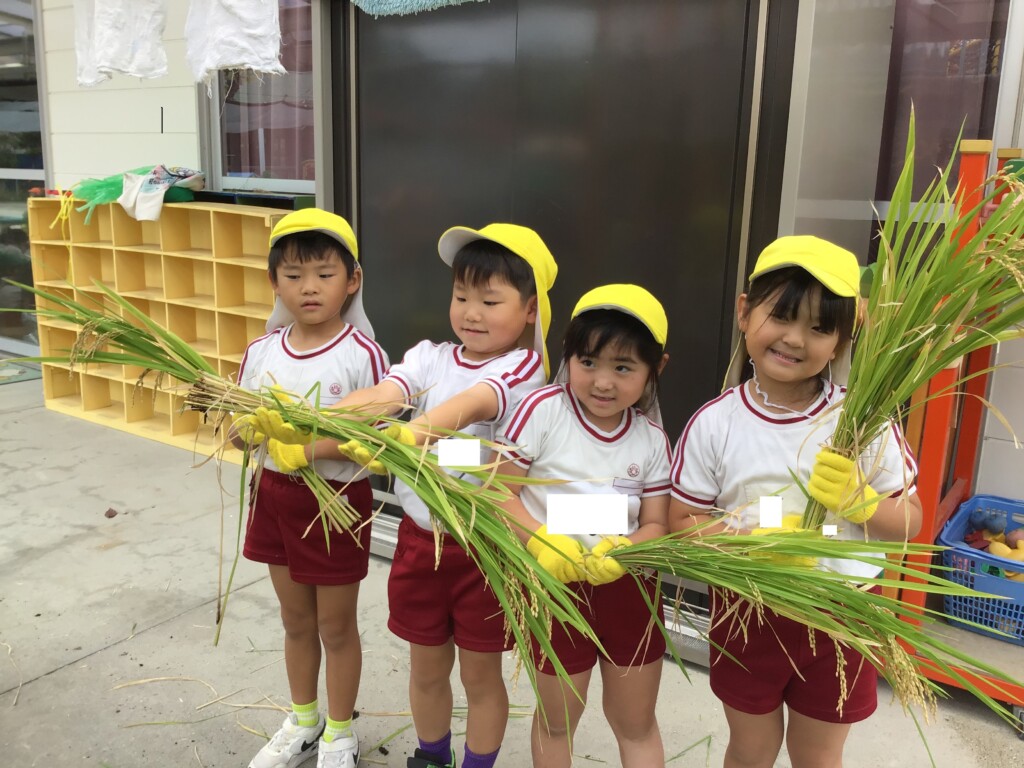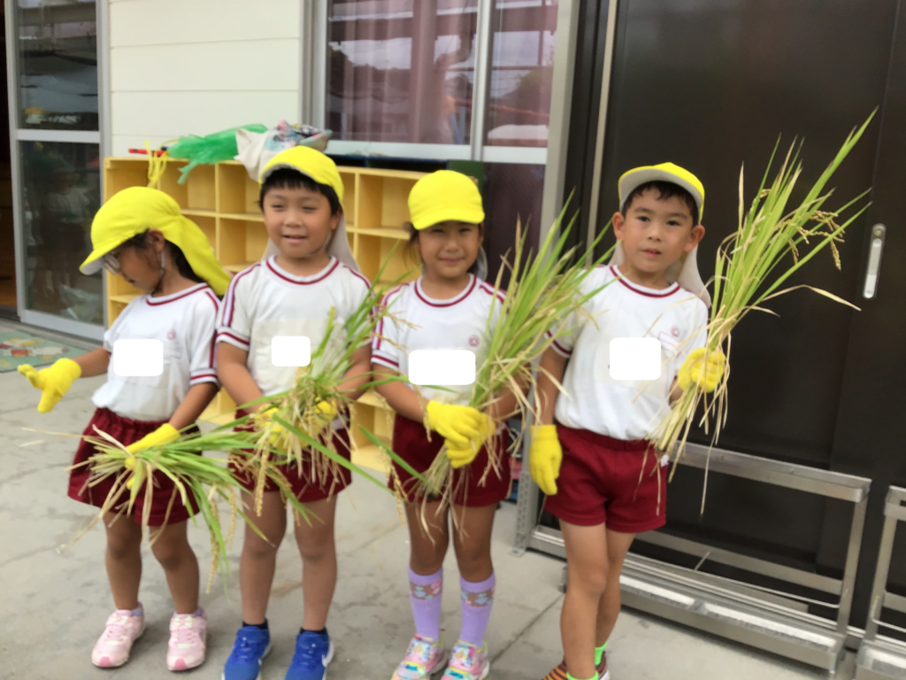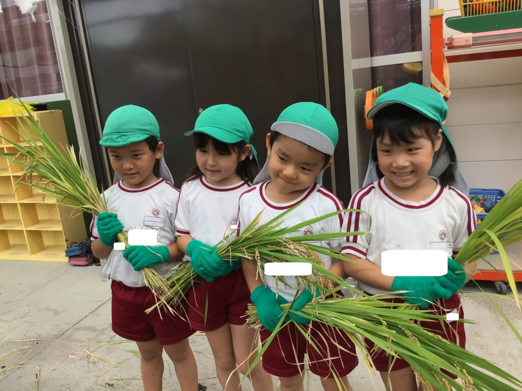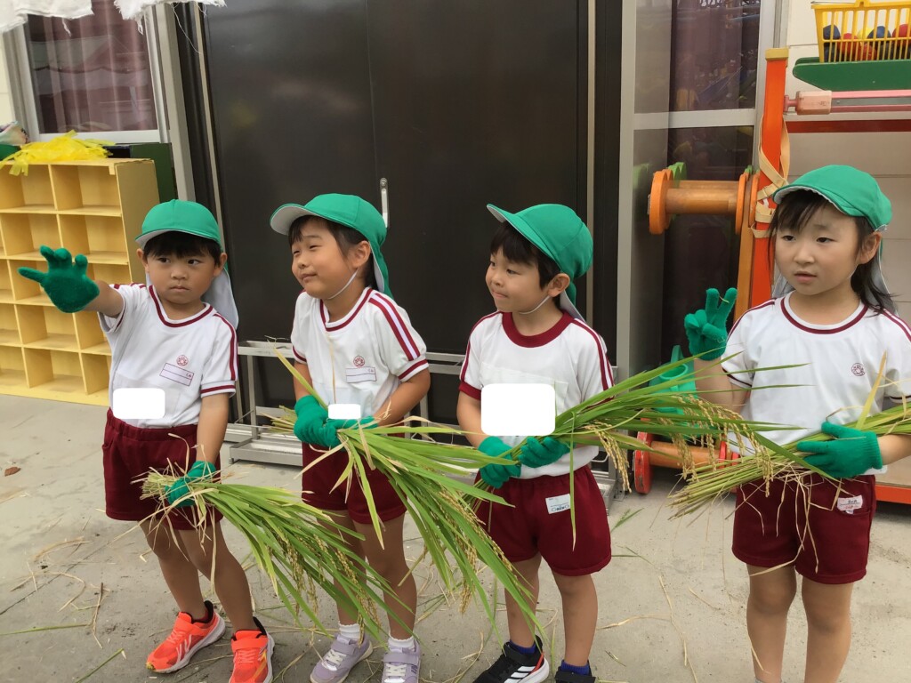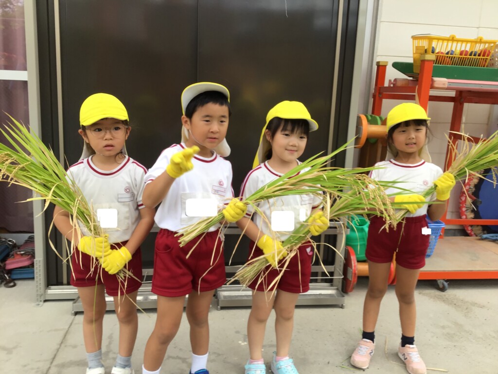 子ども達が育てた稲が立派に穂をつけ,稲刈りをすることができました(^^♪稲刈りをする前に,これまでの活動を振り返り,田んぼで泥んこ遊びをしたことや,田植えや合鴨を放鳥したことを思い出して,稲刈りを行いました。初めて持つ鎌にドキドキしていた子ども達でしたが,頑張って刈った稲を持ちながら笑顔いっぱいでした♪