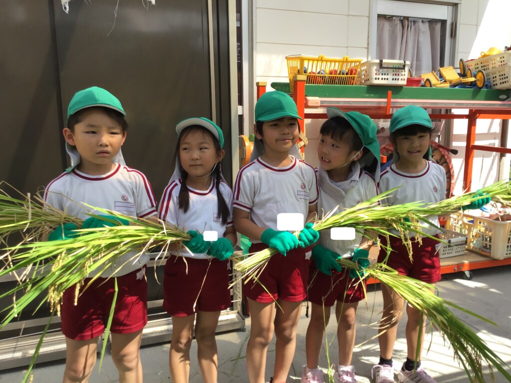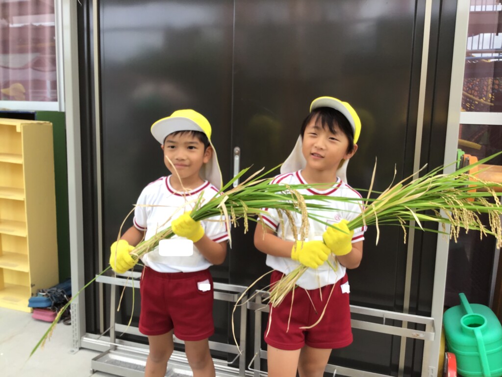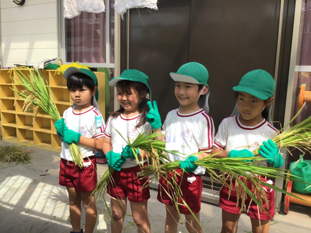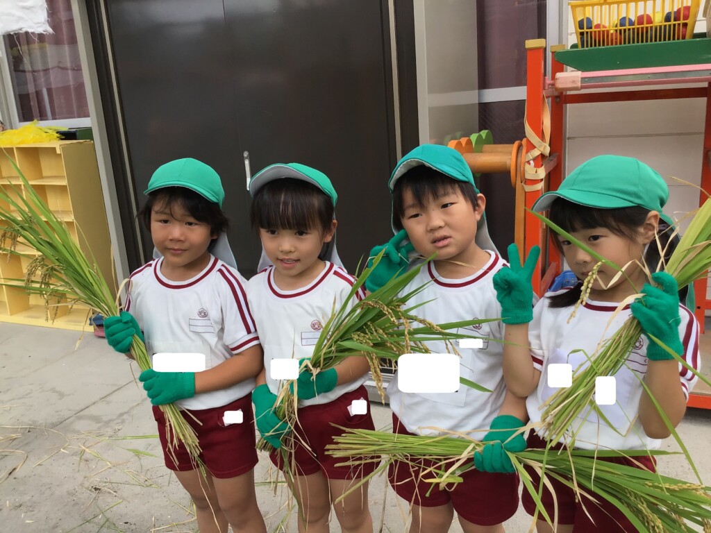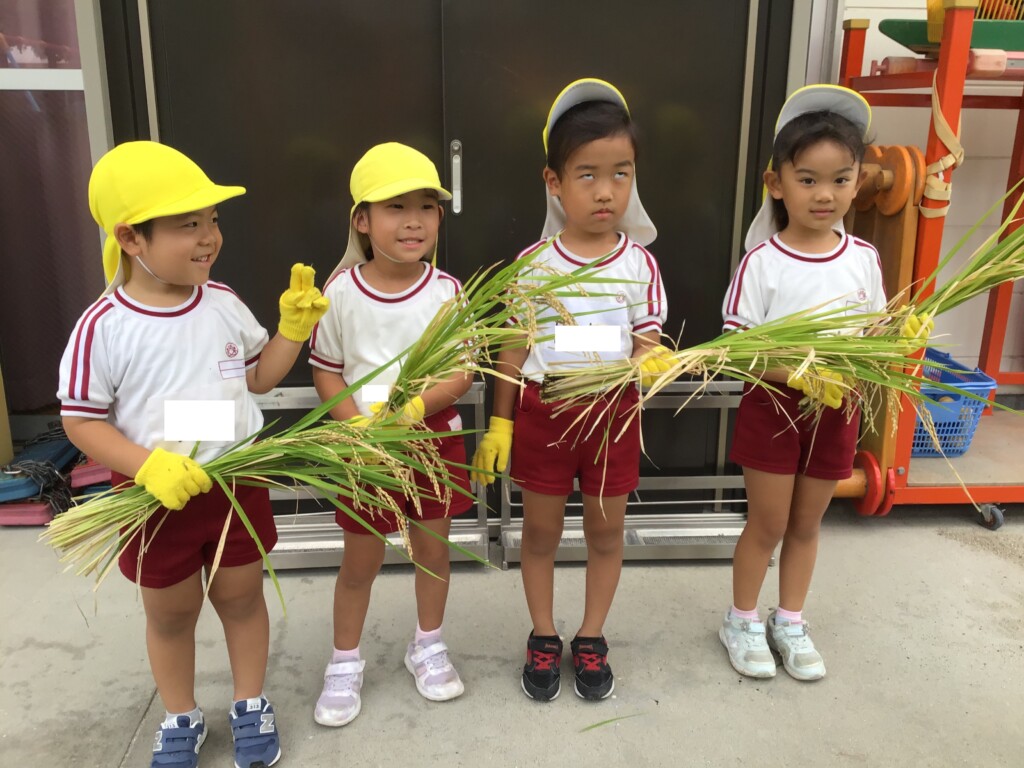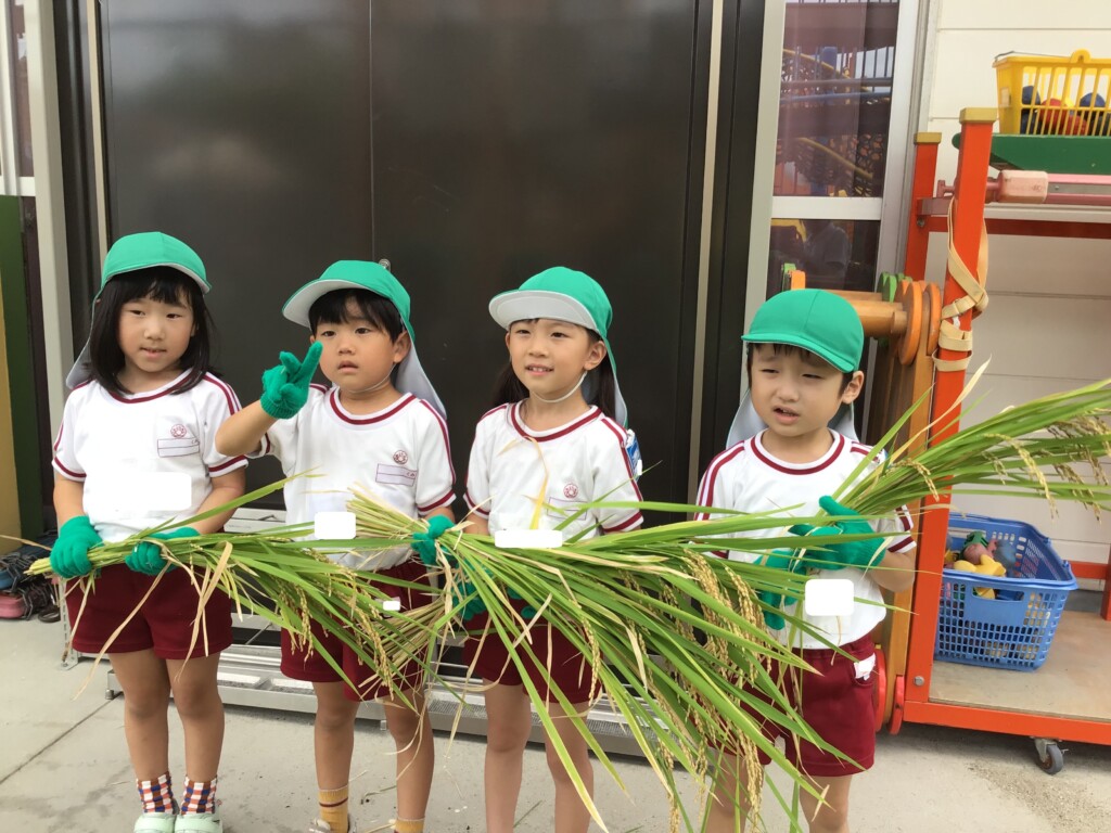 子ども達が育てた稲が立派に穂をつけ,稲刈りをすることができました(^^♪稲刈りをする前に,これまでの活動を振り返り,田んぼで泥んこ遊びをしたことや,田植えや合鴨を放鳥したことを思い出して,稲刈りを行いました。初めて持つ鎌にドキドキしていた子ども達でしたが,頑張って刈った稲を持ちながら笑顔いっぱいでした♪
