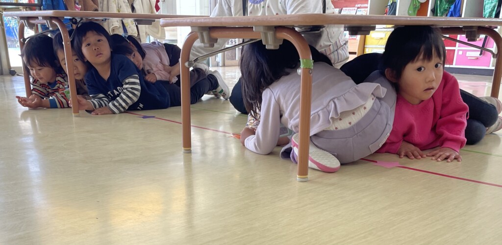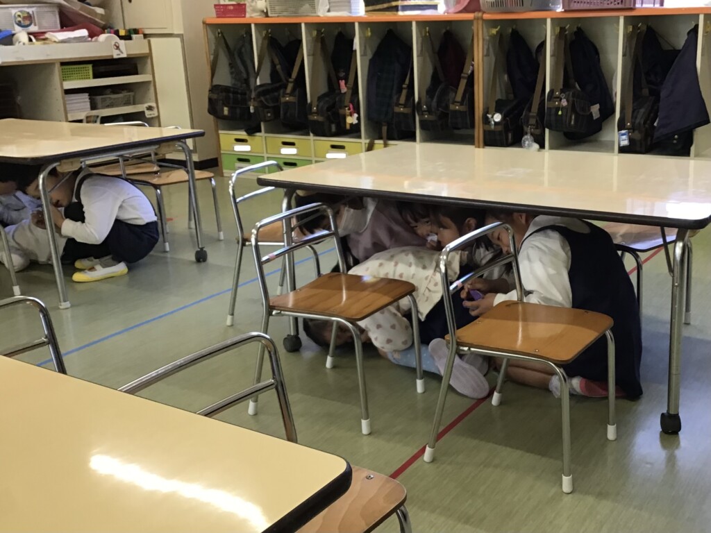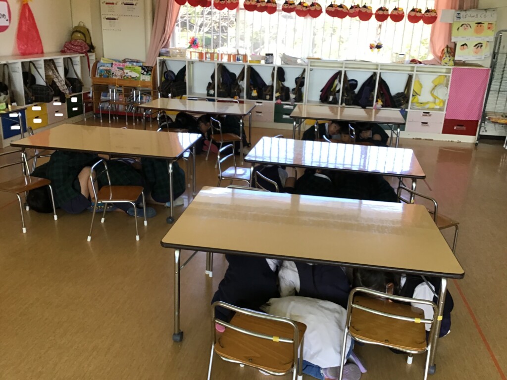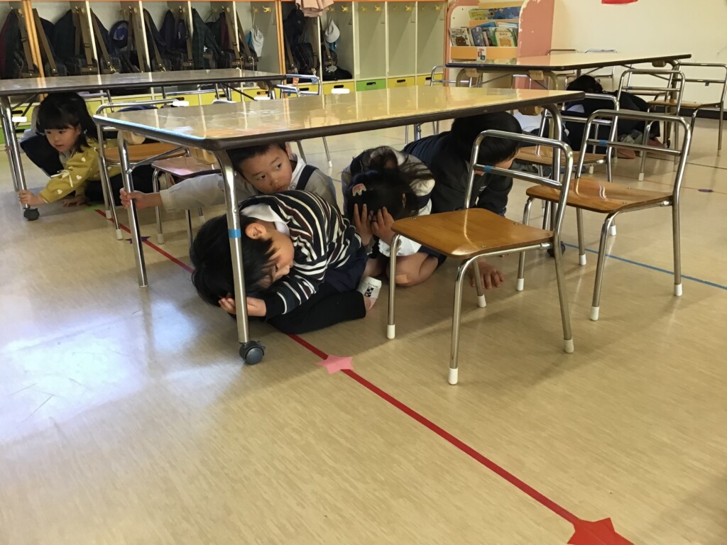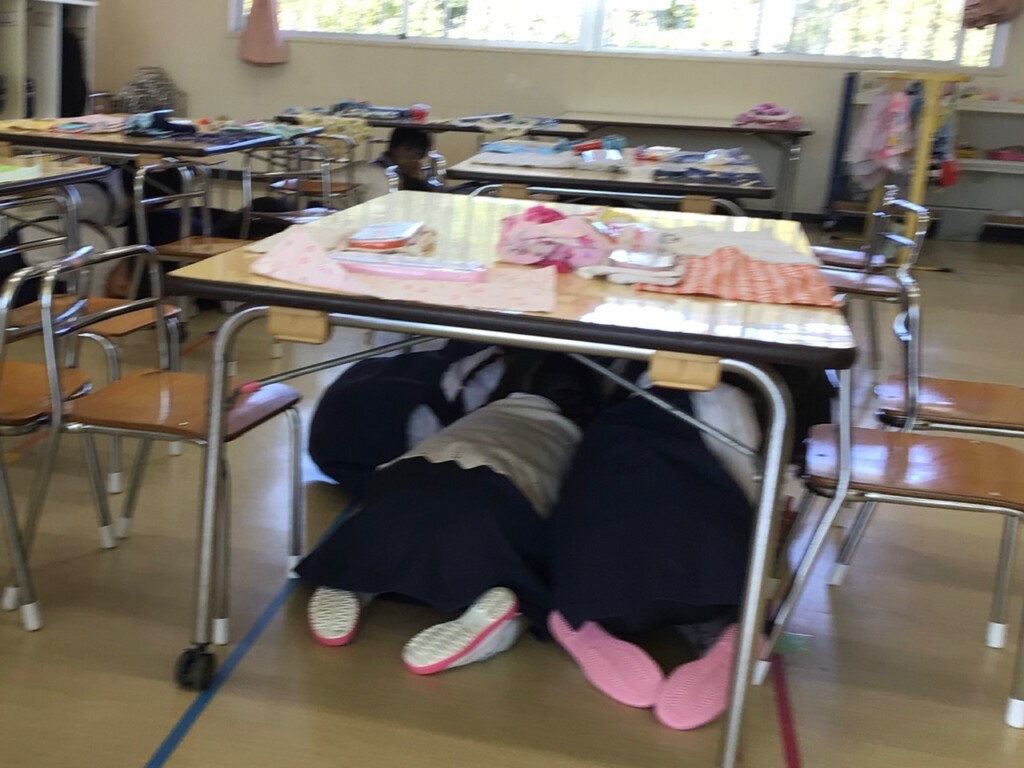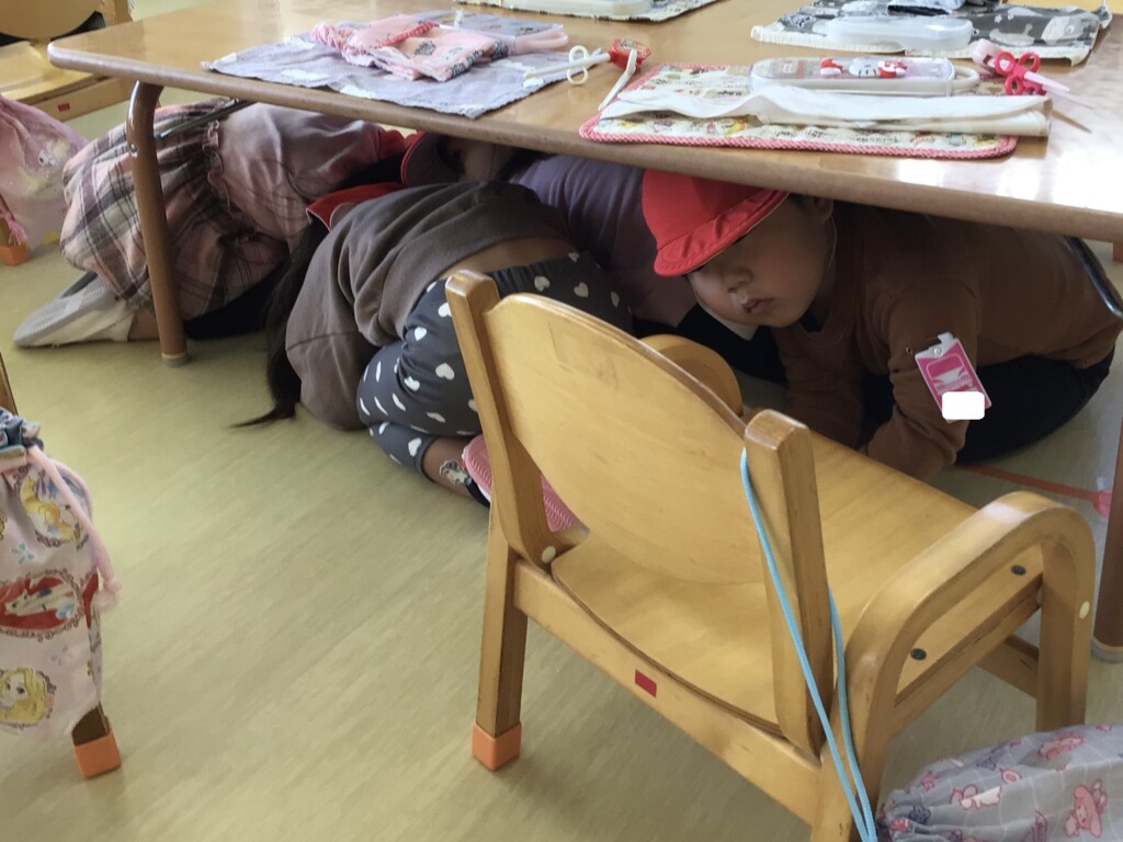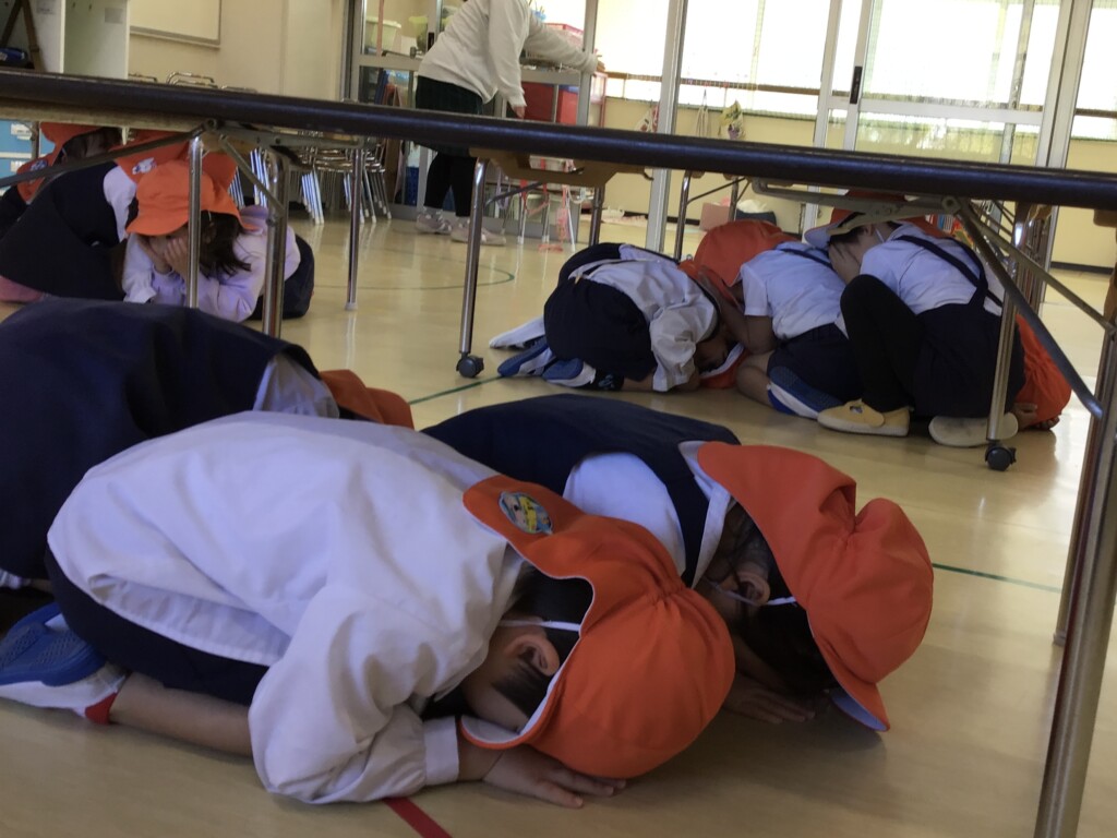 2月18日に地震と火災の避難訓練がありました。地震の放送を聞いてみんなで机の下に隠れることができました。その後は先生の話を聞き,口をハンカチで押さえて静かに避難することができました✨