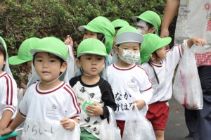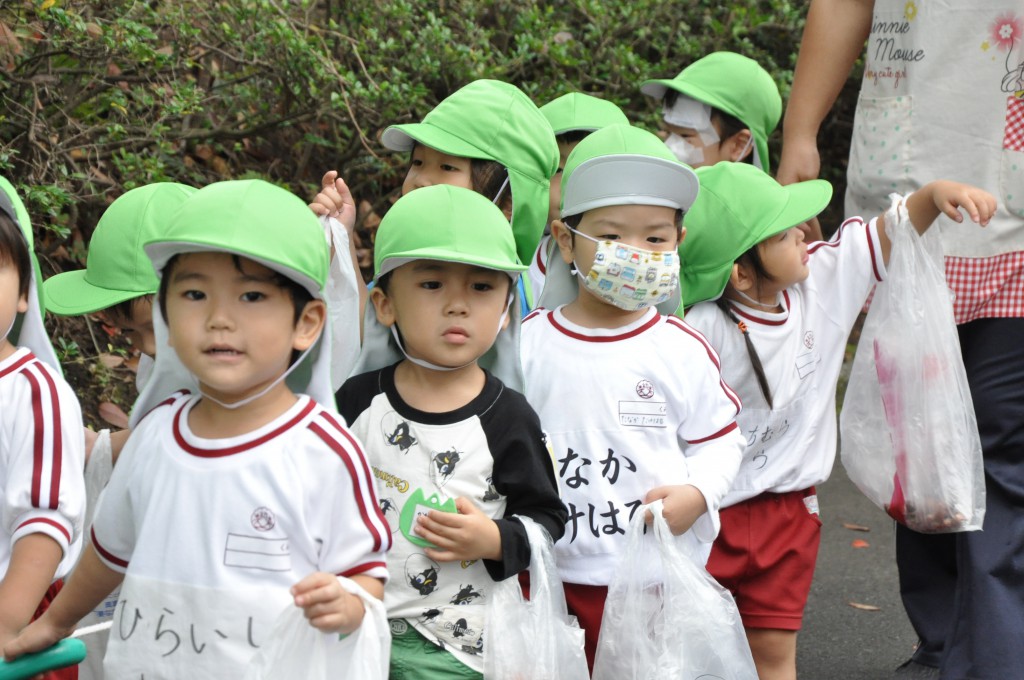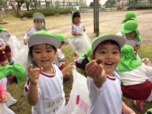 「どんぐりの帽子見つけたよ!」「あっちにもあった~!!」とニコニコしながら、嬉しそうに拾っていたたんぽぽ組さん。
