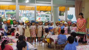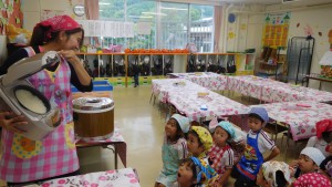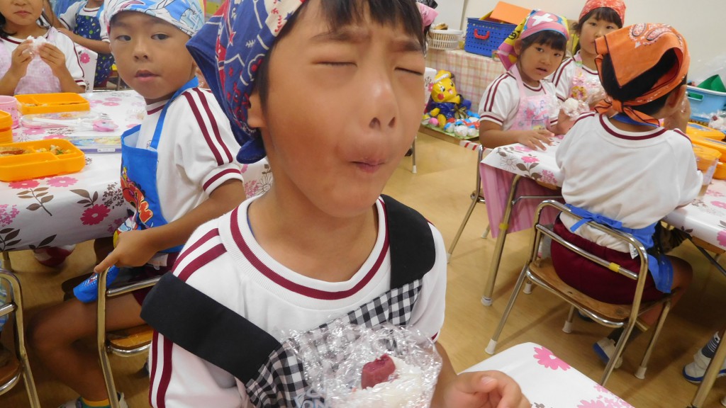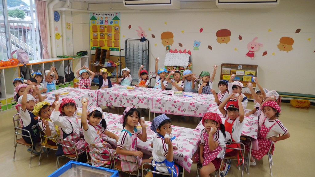 今日は,年長組さんが大切に育てたお米と一生懸命作った梅干しを使っておにぎりを作る,「うめぼしおにぎりパーティー」がありました!子どもたちは朝から,「今日はおにぎり作るんだよね~」「エプロン持ってきたんだよ!!」と期待を持っている姿が見られました!