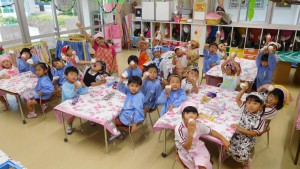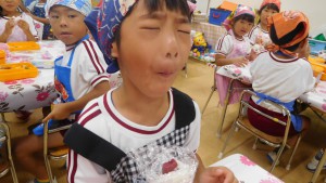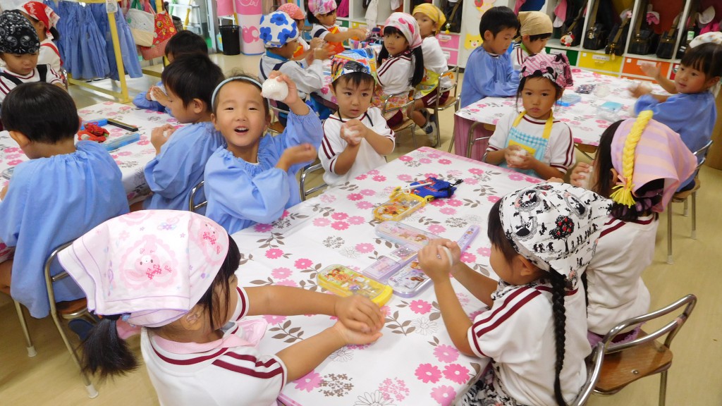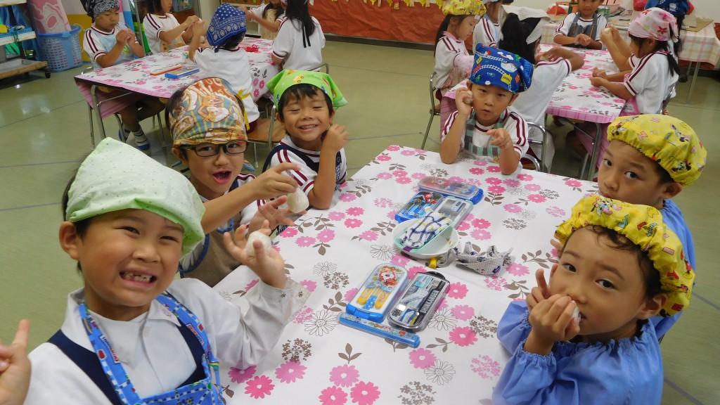 給食の時間には「おおきい組さんのお米美味しいね!」と小さい組さんもとっても美味しくいただきました。自分たちで作ったおにぎりと給食弁当をもりもり食べて,「なんだかいつもよりおいしいね」「もっとおかわりしたいなぁ」と子どもたち。これからもたくさんご飯を食べておおきくなってくださいね☆