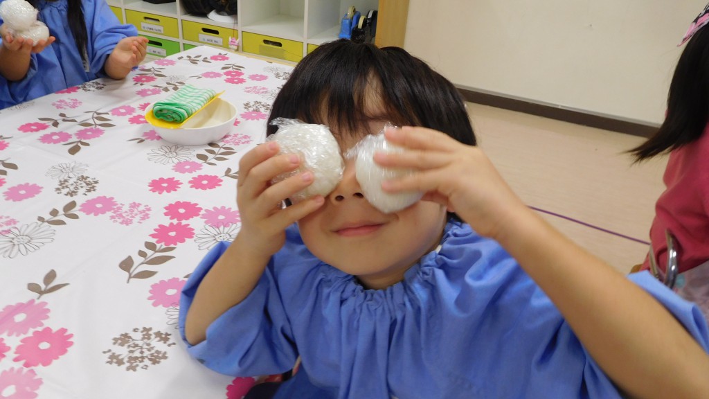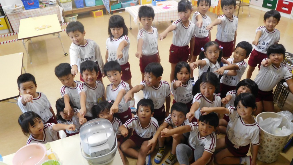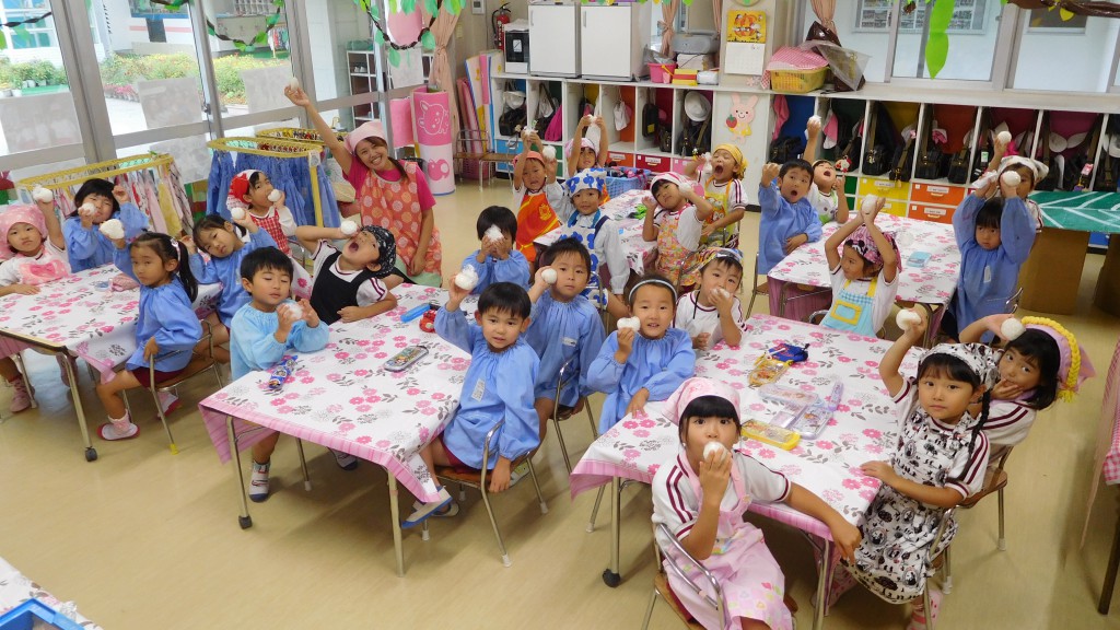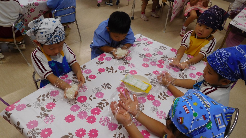 お米をといだ後は炊飯器にセットしてご飯が炊けるのを待ちました。炊きあがると,炊飯器に「お帰りなさーい!」と元気に挨拶をするクラスも!お米を見ながら「ツヤツヤしてるね!」「ぴかぴかのお米美味しそうだね~」と大喜びな子どもたちでした。つやつや美味しそうなお米は,小さい組さんにもおすそ分け★各クラス,年長組さんの美味しいお米と梅干しでおにぎりを作りました!「おいしくなあれ」とおまじないをかけながら握ったり,「梅干しもおいしそう~」と楽しみながらおにぎりを作ることができました!