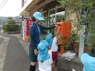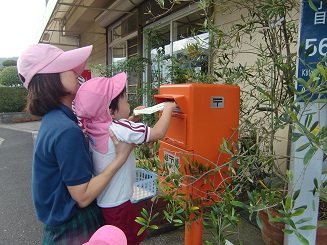今日は年中組で、みんなで気持ちを込めて書いたおじいちゃん、おばあちゃんへのお手紙を持って歩いてあるところまで行きました♪てくてく歩いていく中で「もうすぐ着くかな~?」「どこまで行くの~?」と、とてもドキドキワクワクした様子でした!そして。。。みんなのお手紙を届けてくれるポストに到着!!一生懸命、手を伸ばしてお手紙を投函する姿や、自分でできる!!とはりきった様子の子どもたち♪にこにこ笑顔の子どもたちでした!おじいちゃん、おばあちゃんが喜んでくれますように・・・♪