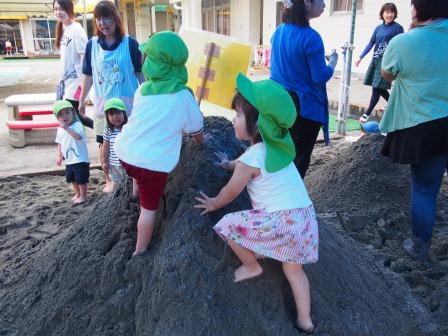 はじめ,砂場の周りをみんなで歩いて,せーの!で入りました。大きな山に喜んでのぼったり,温泉に見立てた穴にみんなで入って楽しんだり,それぞれが砂の感触を楽しみながら,遊んでいました。慣れてくると,たんぽぽさんと体験の子どもたちが自然と一緒に遊んでいる姿は,とても微笑ましかったです♪