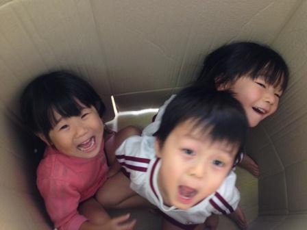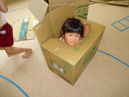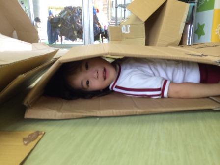 子どもたちは箱の中に入って、バスごっこをしたり、布団に見立てて寝たりする姿がありました。