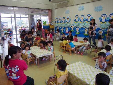 今日は公開保育2日目でした。今日もあいにくの雨…。子どもたちは、なぜか朝から「今日はプール??」とつぶやいていました。なぜだろう??と思っていたら、園庭に他のクラスがするビニールプールが準備されていたからでした!!どうやら、自分達が水遊びをすると思っていたようです。