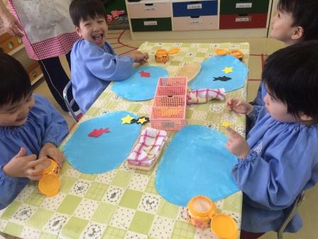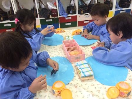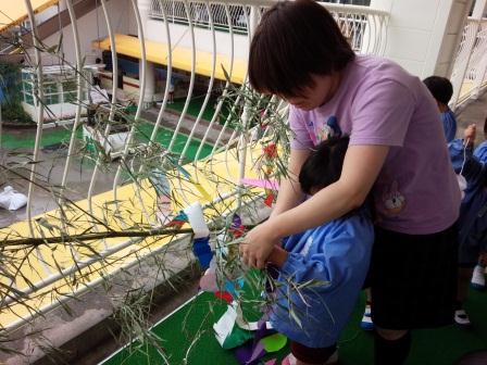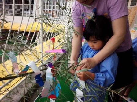 今日は,公開保育2日目がありました。年少組では,事前に絵の具でぬたくりした風鈴に,金魚や星の飾り付けをしました。本物の風鈴を見てイメージを持った子どもたちは,「いっぱい金魚さん張っていい~?」「赤い金魚だけ張る~!」など,それぞれ飾り付けを楽しみました。「金魚さん泳いでるね」「先生見て見て~」と,子どもたちの発言もたくさんでした。「お願い事も書いて一緒に飾ろうね」と伝えると,「わ~楽しみ~」と,わくわくする子どもたちでした。参加してくれたお友達も,お母さんと一緒に飾り付けをして,楽しむことができました。今までに作ってきた七夕飾りを飾る活動もすると,
