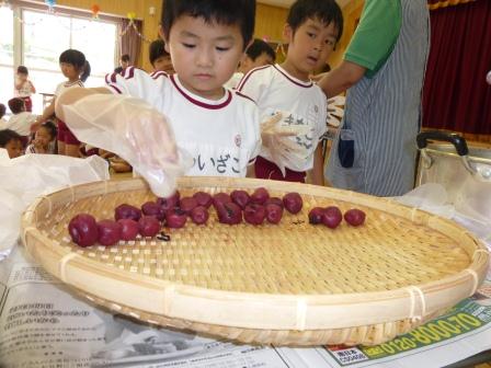 今日は年長組で梅の日干しに挑戦しました。5月に梅ちぎりを行い,7月に梅のしそ漬け,そして今回出来上がった梅を日干しにしました。子どもたちは,樽から出てきた真っ赤な梅を見て,大喜び!!!「やっと赤い梅になったね」や「うわぁーすっぱいにおいがするー!!」といろいろなつぶやきが聞こえてきました。
