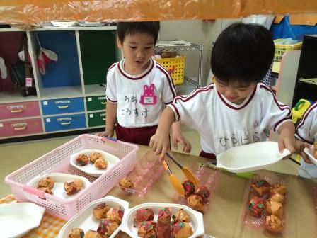 うめ組さんはたこ焼き屋さんとヨーヨー釣り☆ばら組さんは、バーベキューと魚釣り☆もも組さんは焼きそば屋さんとアイスクリーム屋さん☆をお部屋で楽しんでいます♪年少3クラス、そして年中さんや年長さんのお部屋にも出かけていろいろな遊びを夏季保育3日間でもっともっと楽しんでいきたいと思います!!