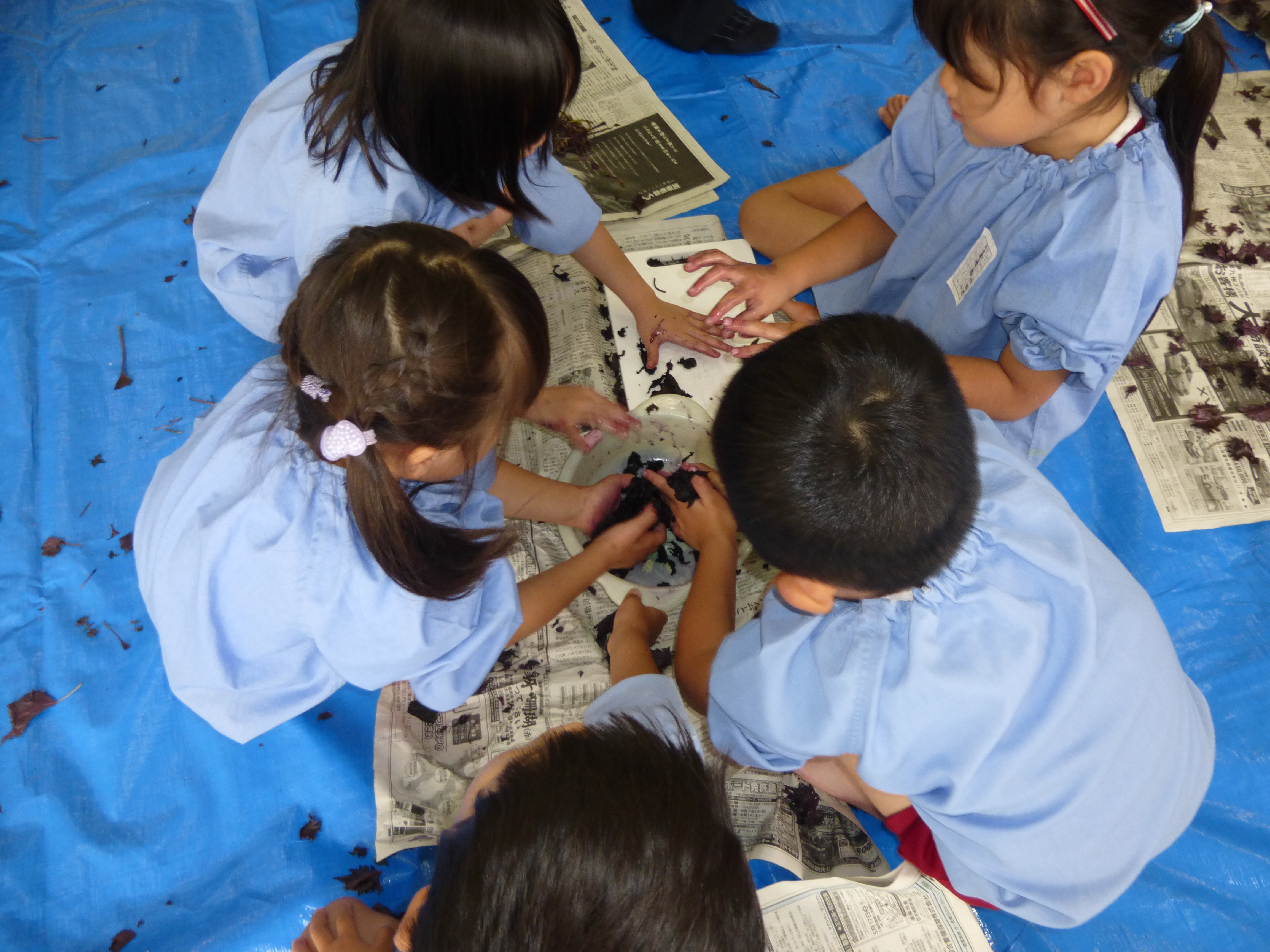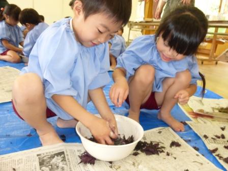 その答えは,今日取り組んだ梅干しシソ漬けです。赤シソを塩でもみこんだり,たたいたりして,シソから汁がでます。子どもたちは「うわー紫の手になったよ」「もっと出ないかな!!」と一生懸命もみこみました。